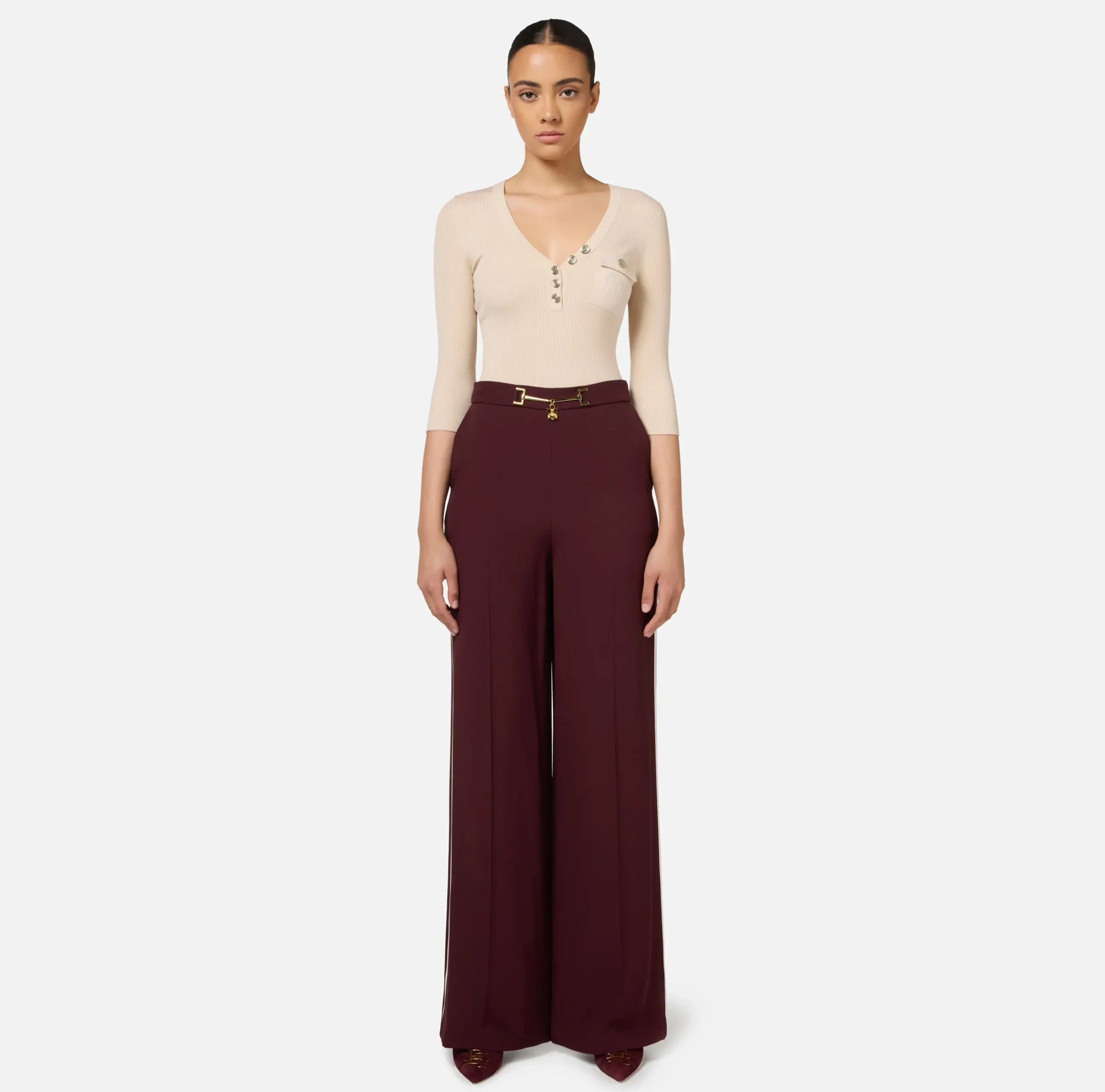 Be the first to review “Pantaloni E Shorts|Elisabetta Franchi Pantalone palazzo in satin con morsetto RougeNoir/Burro” Annulla risposta