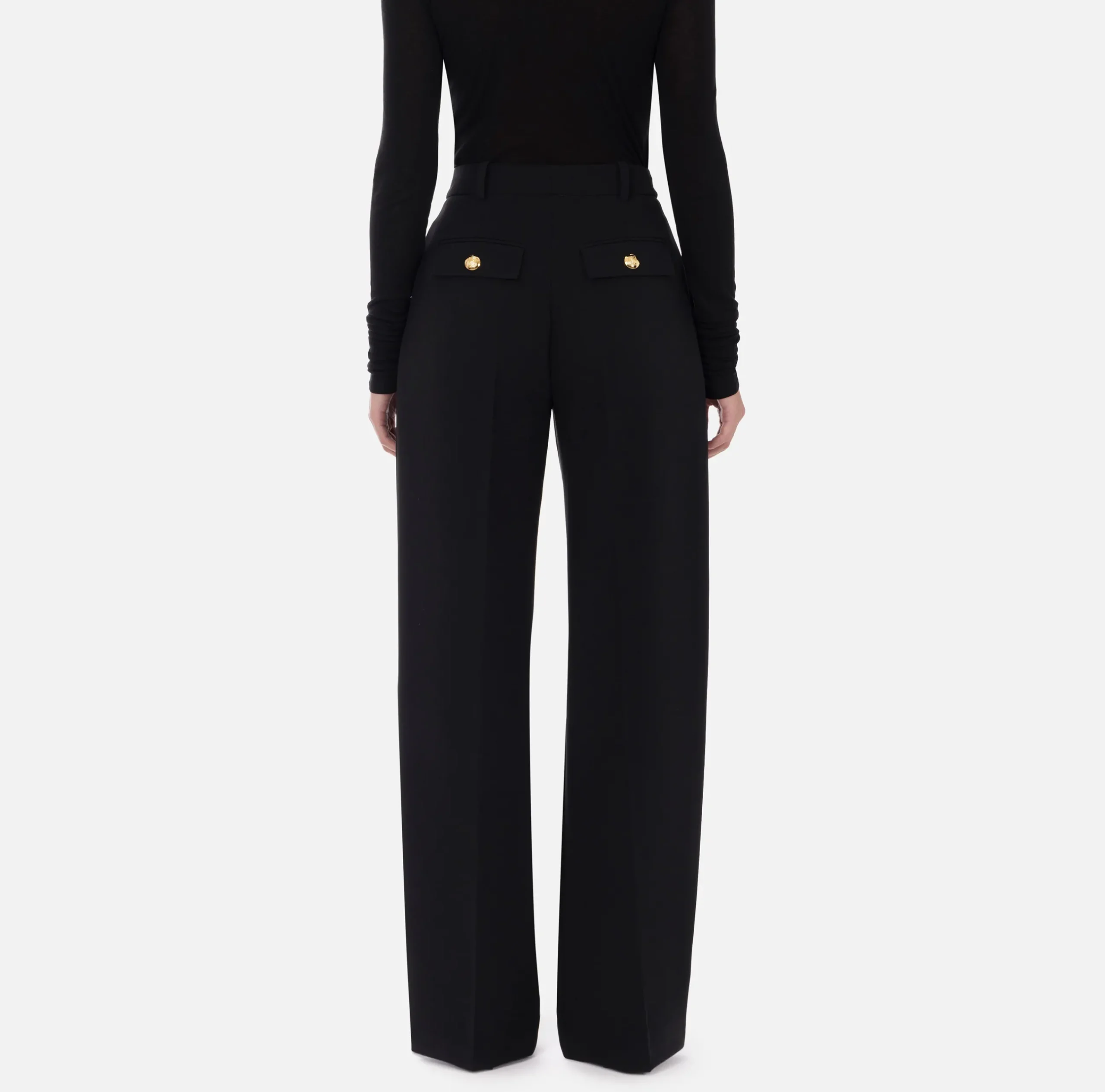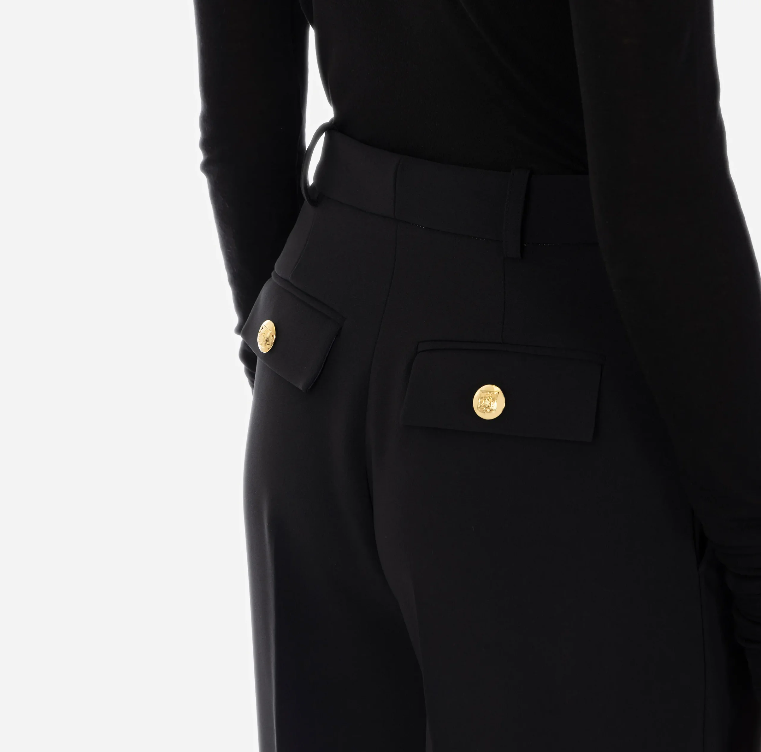 Pantaloni in crêpe stretch leggero. La costruzione sartoriale è data dalle ampie pinces sul davanti e dal fascione interno preformato. Sono caratterizzati da tasche posteriori con patte e bottoni in metallo dorato.