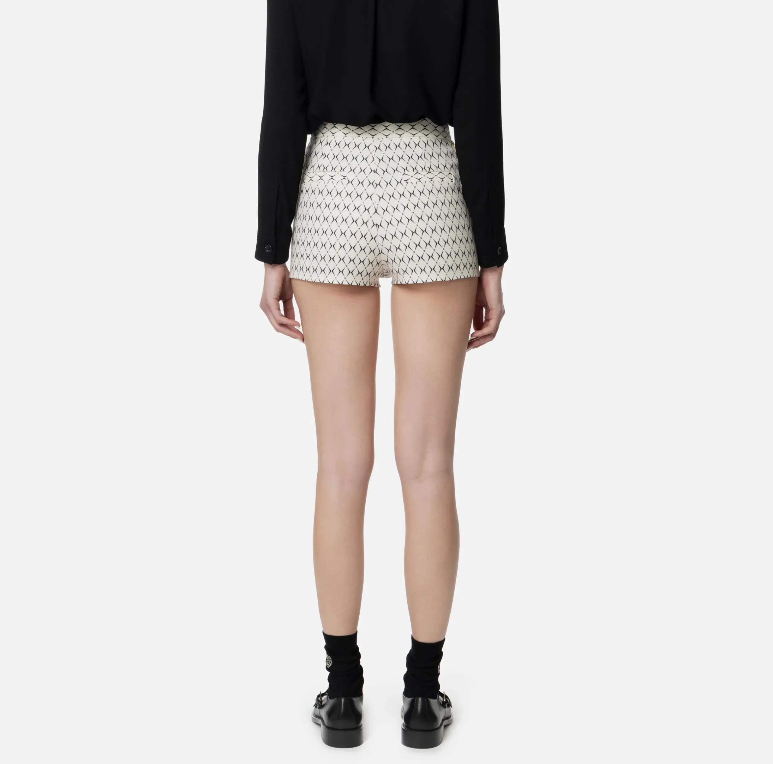Short culotte in crêpe stretch stampa rombo a vita alta. Il punto vita è enfatizzato da una cintura in catena infilata e charms logo in metallo dorato.