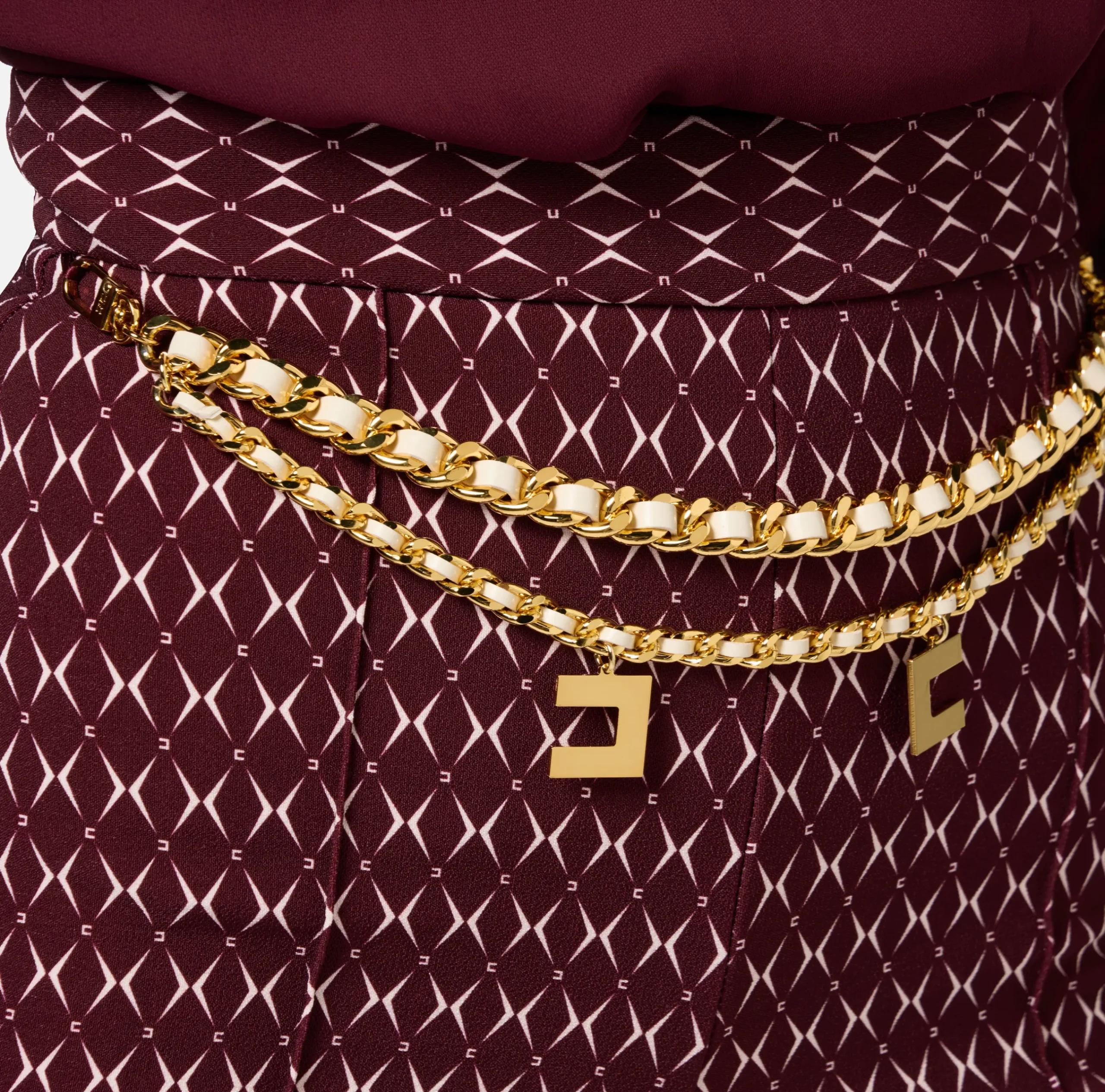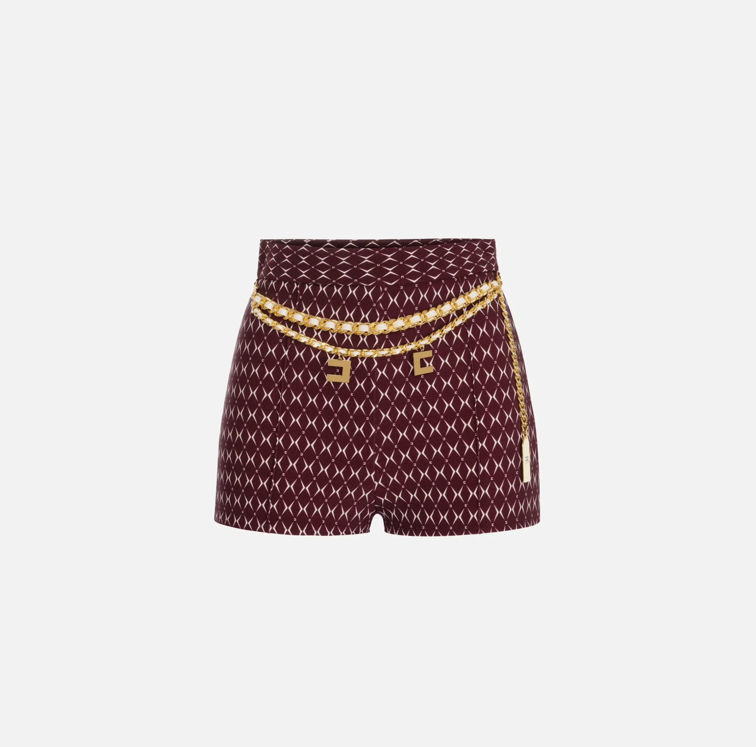Short culotte in crêpe stretch stampa rombo a vita alta. Il punto vita è enfatizzato da una cintura in catena infilata e charms logo in metallo dorato.