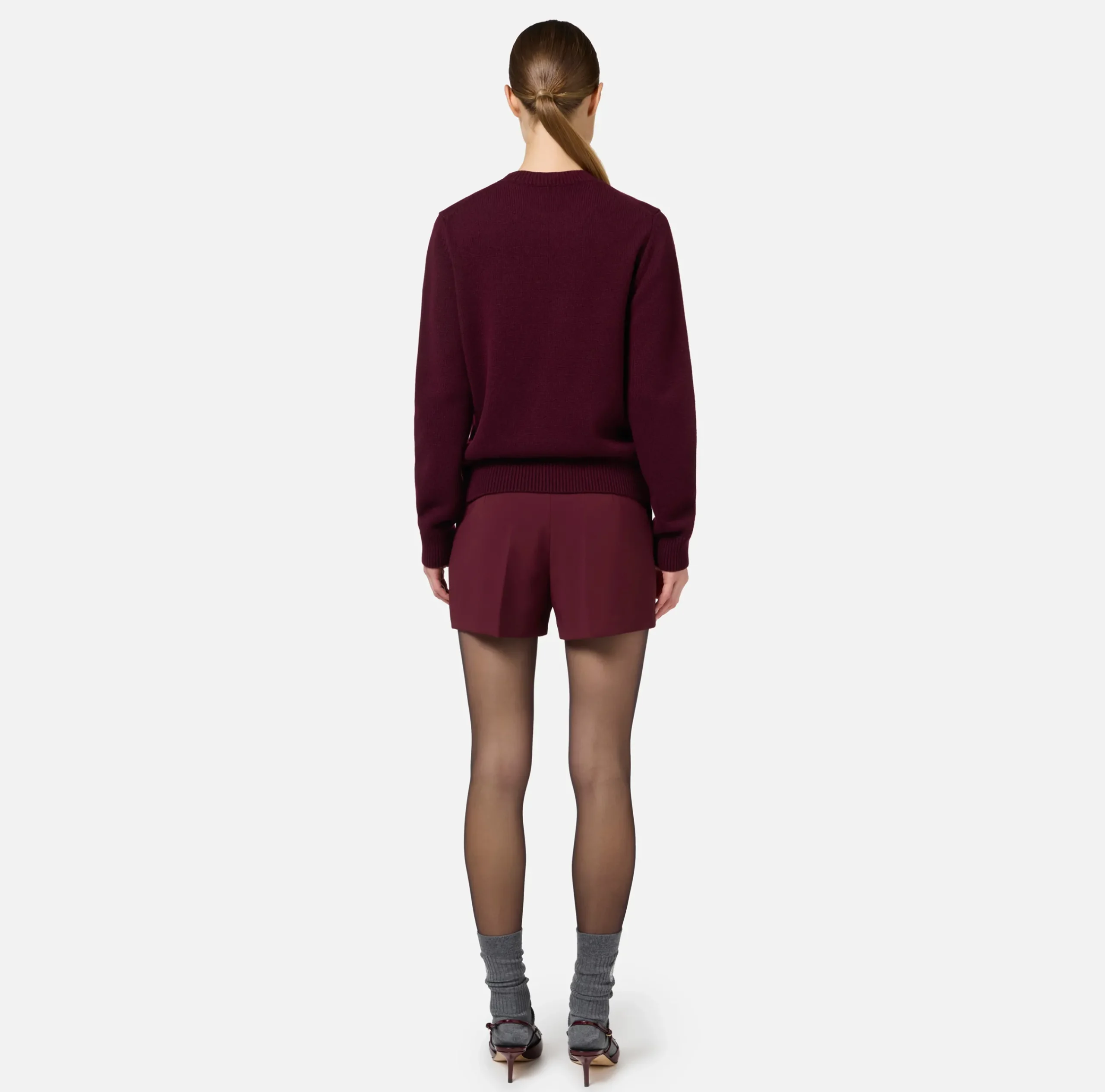 Short con vita alta in doppio crêpe stretch. È caratterizzato da fascione con morsetto logo in metallo dorato.