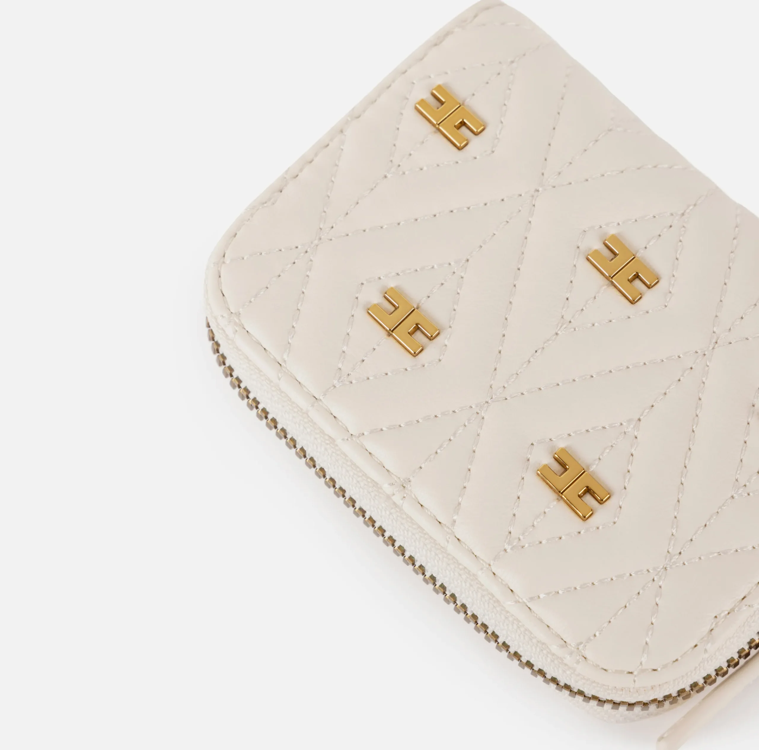 Portafoglio in materiale sintetico effetto pelle. Superficie trapuntata e imbottita con rivetti logati in metallo dorato vintage. È caratterizzato da tirazip logato.
