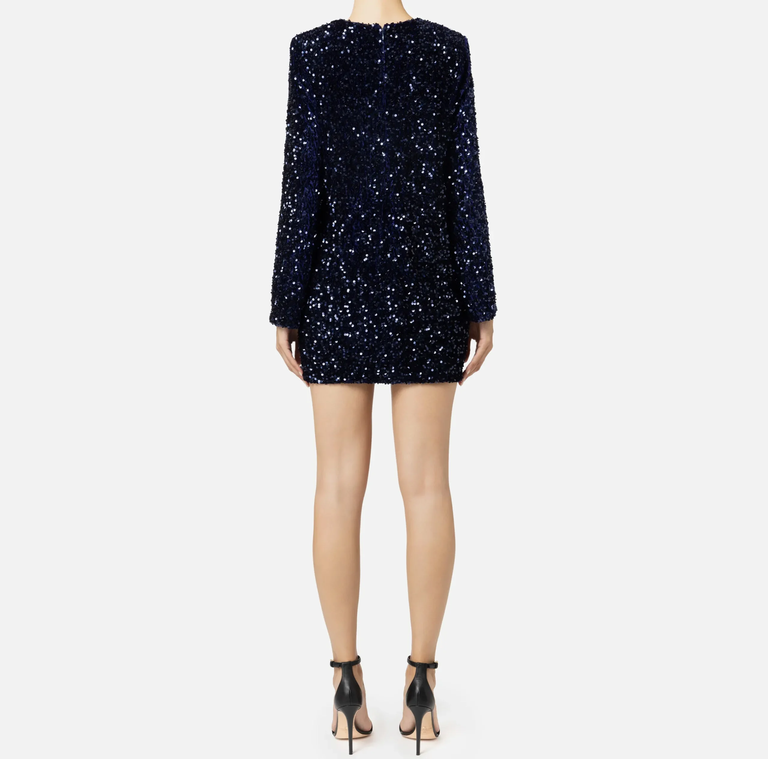 Miniabito boxy in ciniglia ricamata con pailettes a maniche lunghe con scollo a giro. È caratterizzato da spalle strutturate e design che chiude leggermente al fondo.