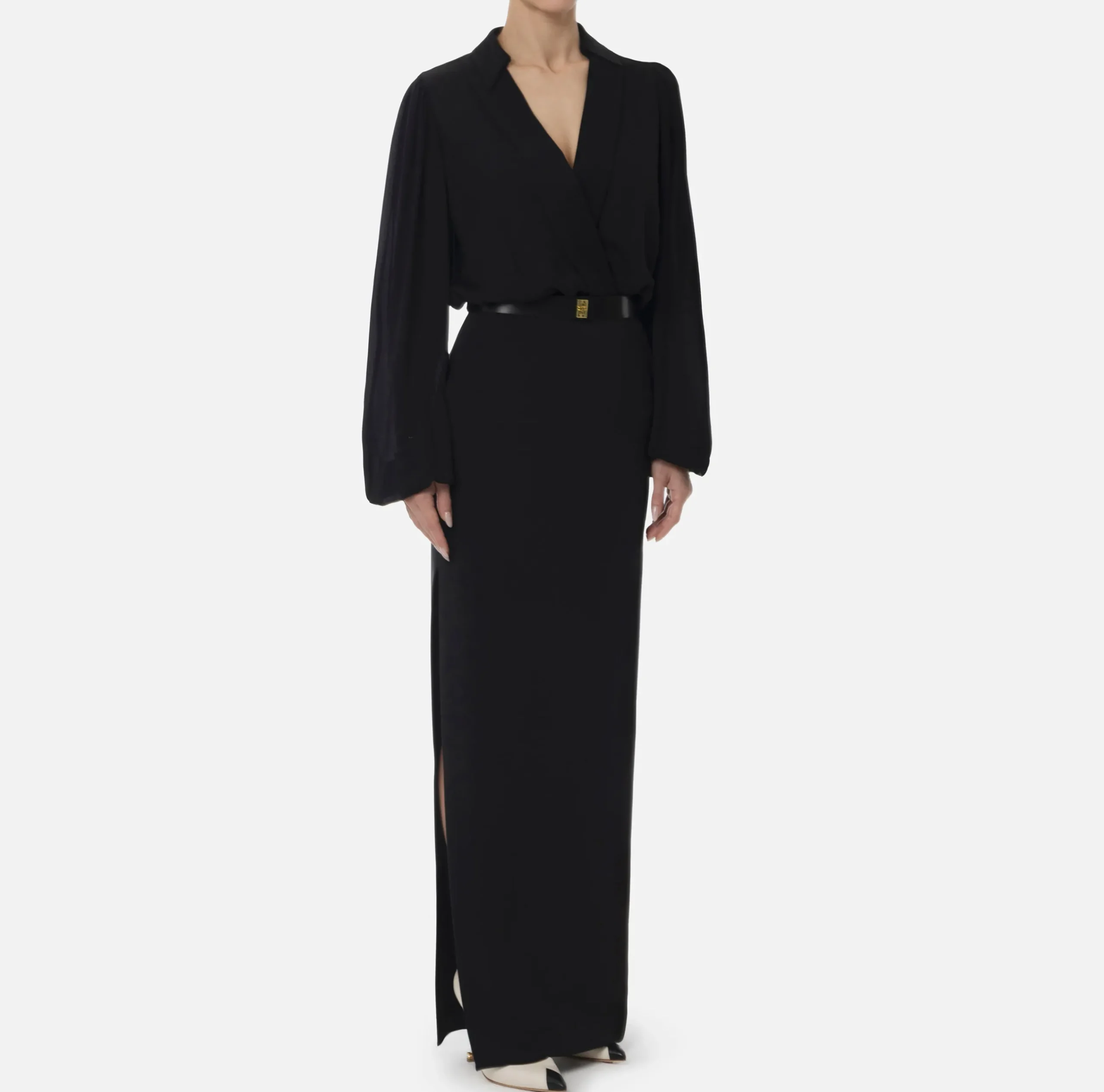 Abito in crêpe caratterizzato da camicia a maniche lunghe incrociata sul davanti e gonna lunga con vestibilità a sirena. Il punto vita è enfatizzato da una cintura in materiale sintetico effeto pelle con placca logo in metallo dorato.