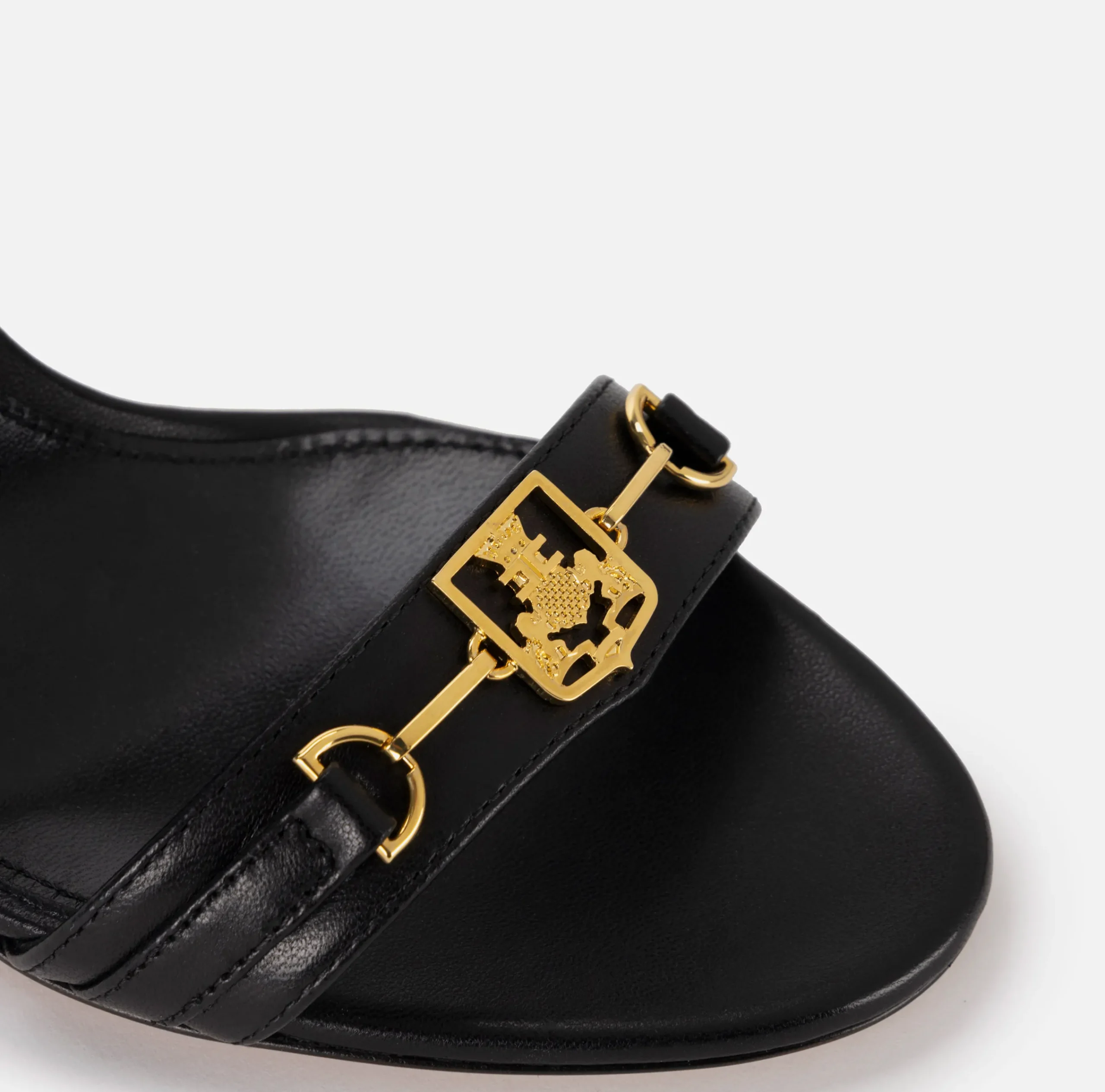 Sandalo in nappa su tacco fasciato e cinturino regolabile sulla caviglia. È caratterizzato da morsetto in metallo dorato posizionato su una fascetta in pelle.