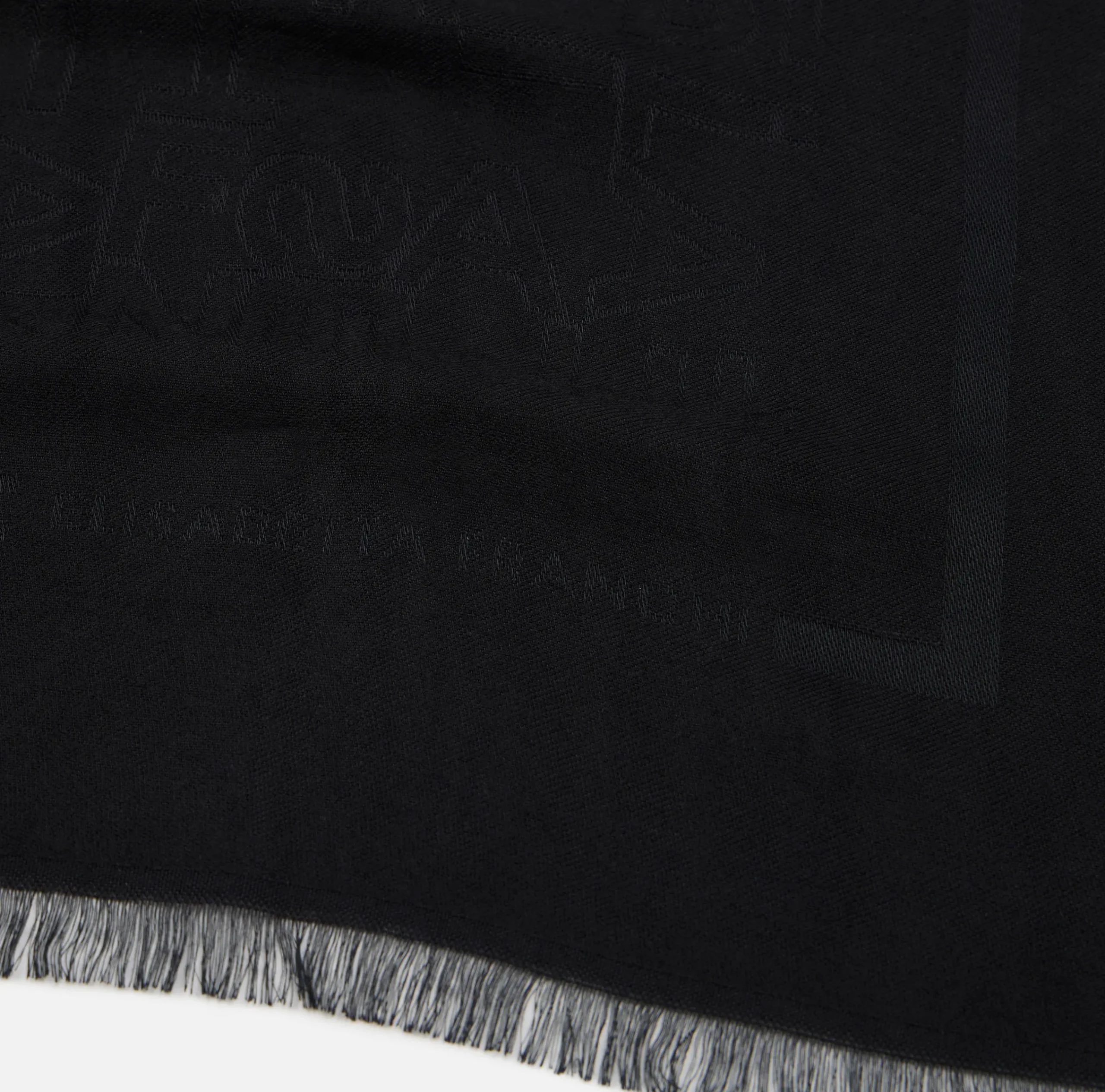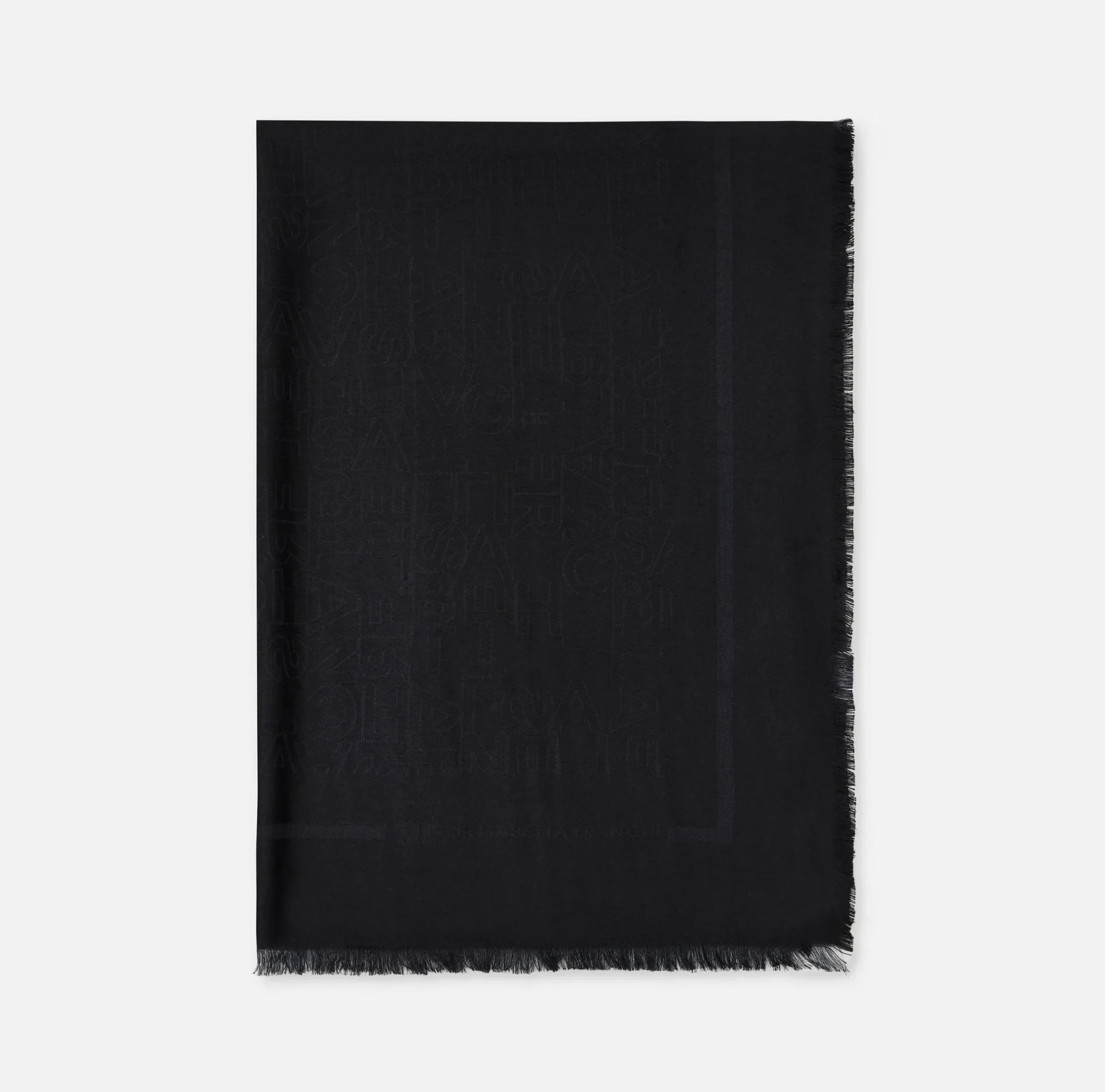 Pashmina in viscosa modal tinto pezza con lettering jacquard all-over e cornice con bordo sfrangiato.