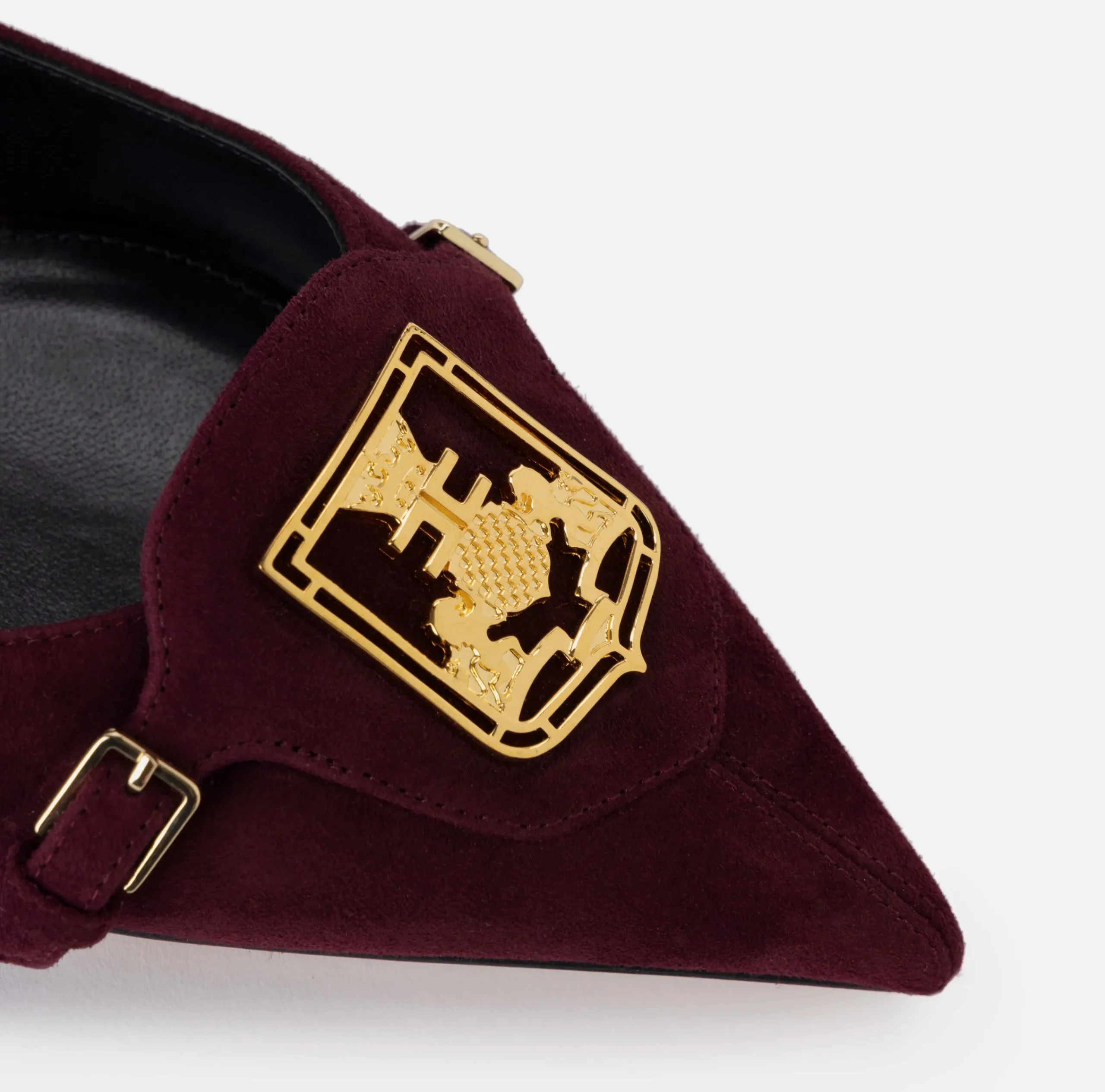 Ballerina in camoscio. È caratterizzato da patta con applicazione di placca scudetto in metallo dorato.