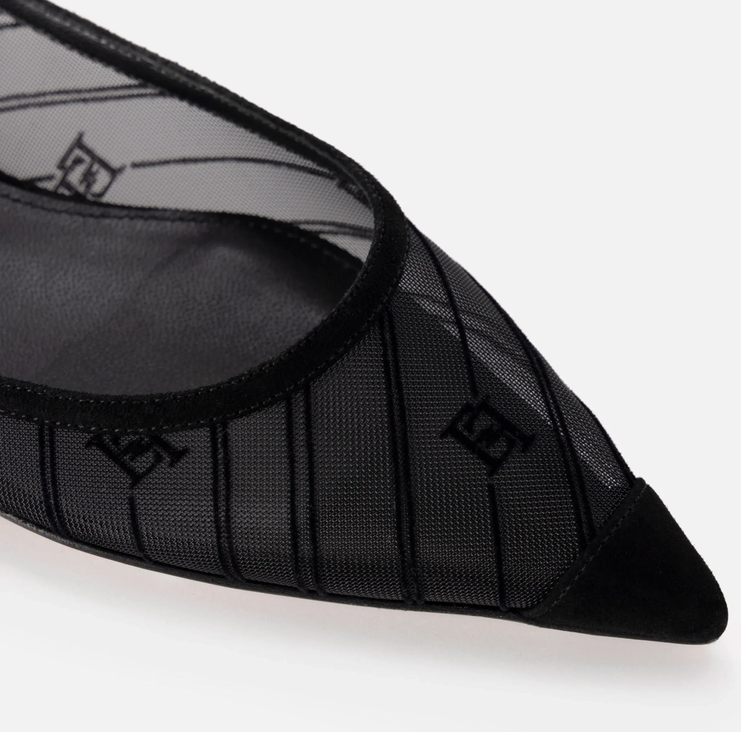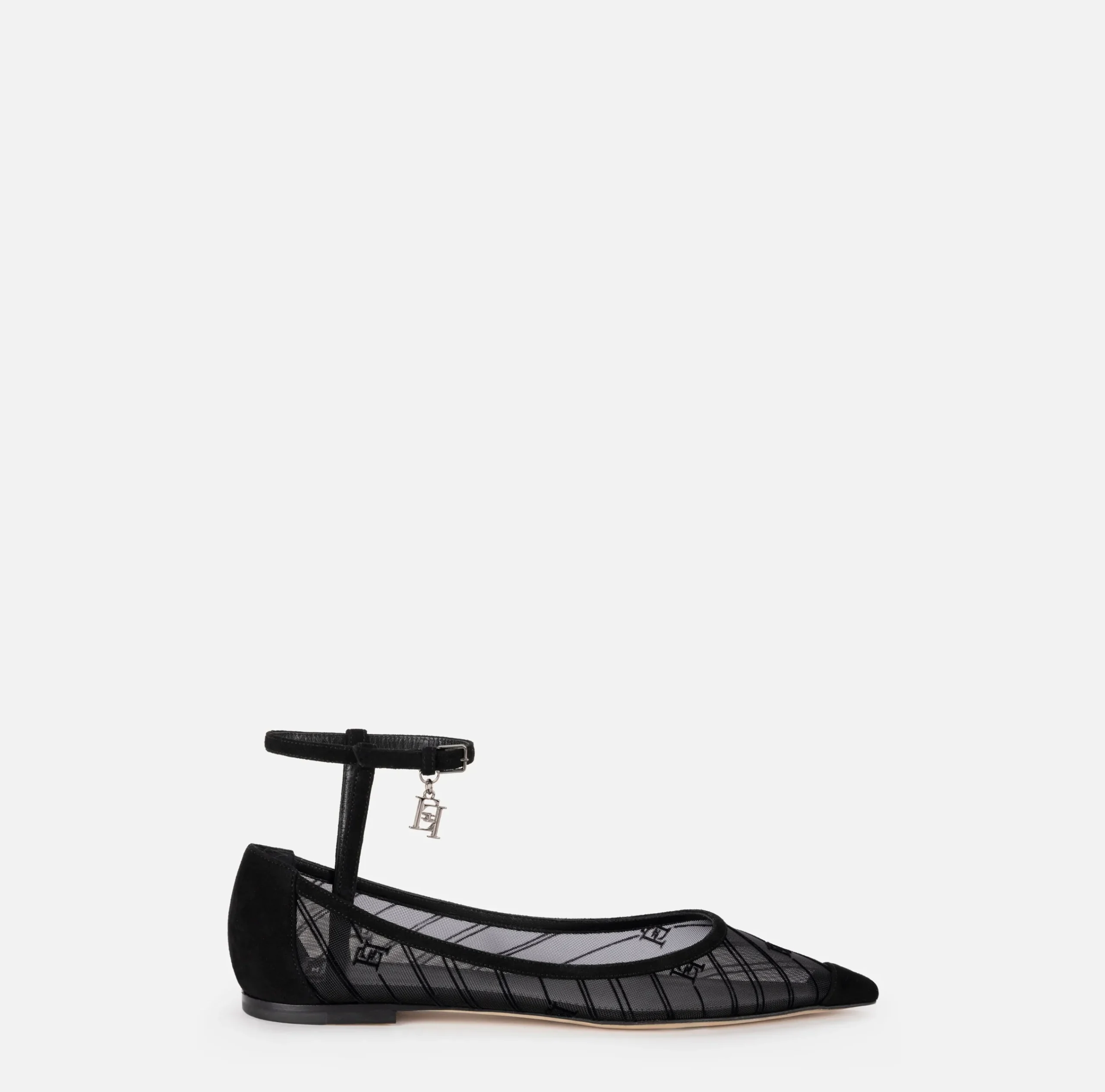Ballerine in rete flock con puntalino in gros grain. È caratterizzata da cinturino alla caviglia regolabile da fibbia con charms logo in metallo dorato.