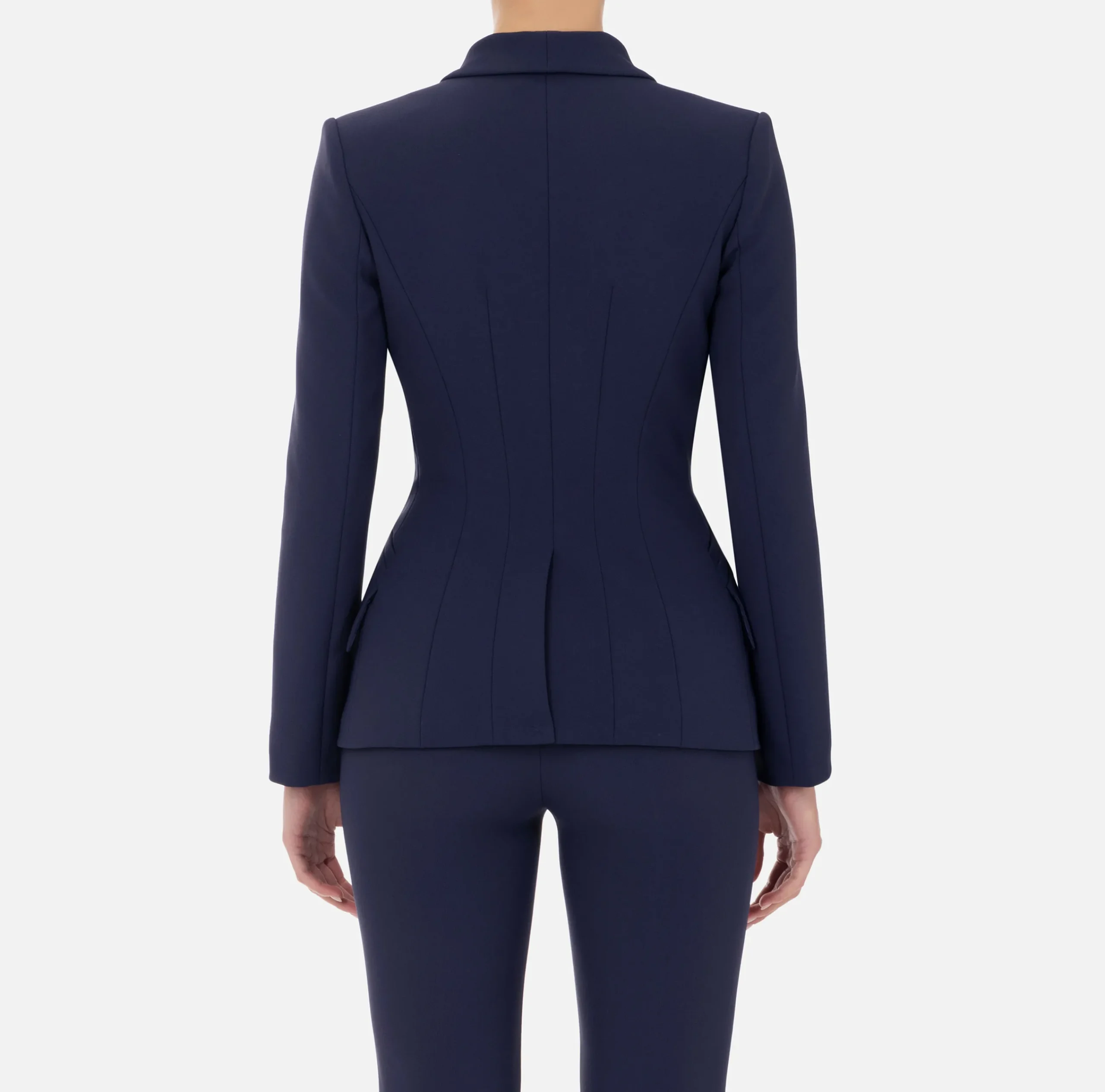 Giacca doppiopetto in crêpe stretch con tasche frontali a filetto e con pattina. È caratterizzata da revers sciallato e ricamo logo ad altezza seno in tono.