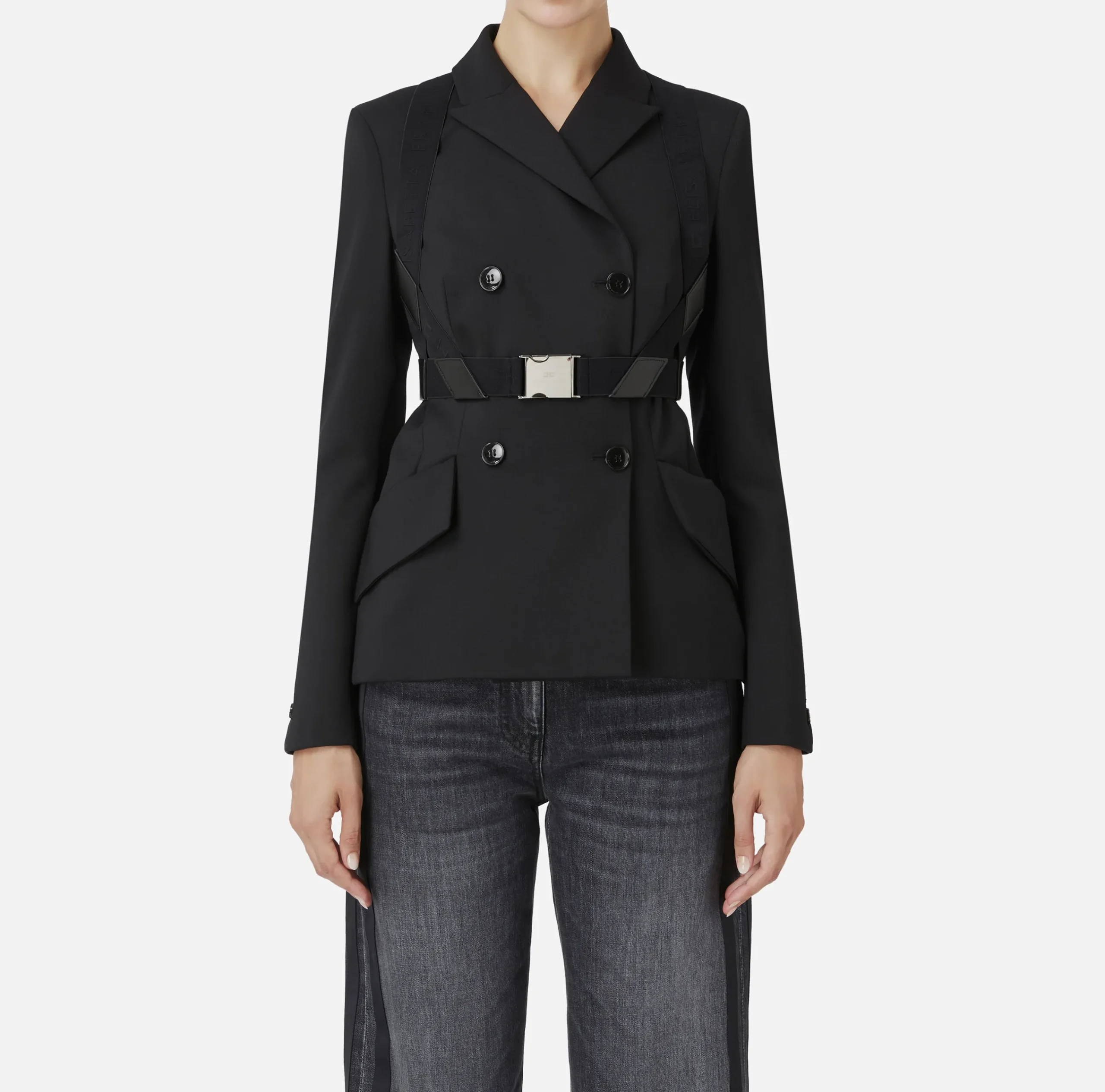 Tailleur|Giacche & Trench|Elisabetta Franchi Giacca doppiopetto in fresco lana mélange con harness elastico Nero