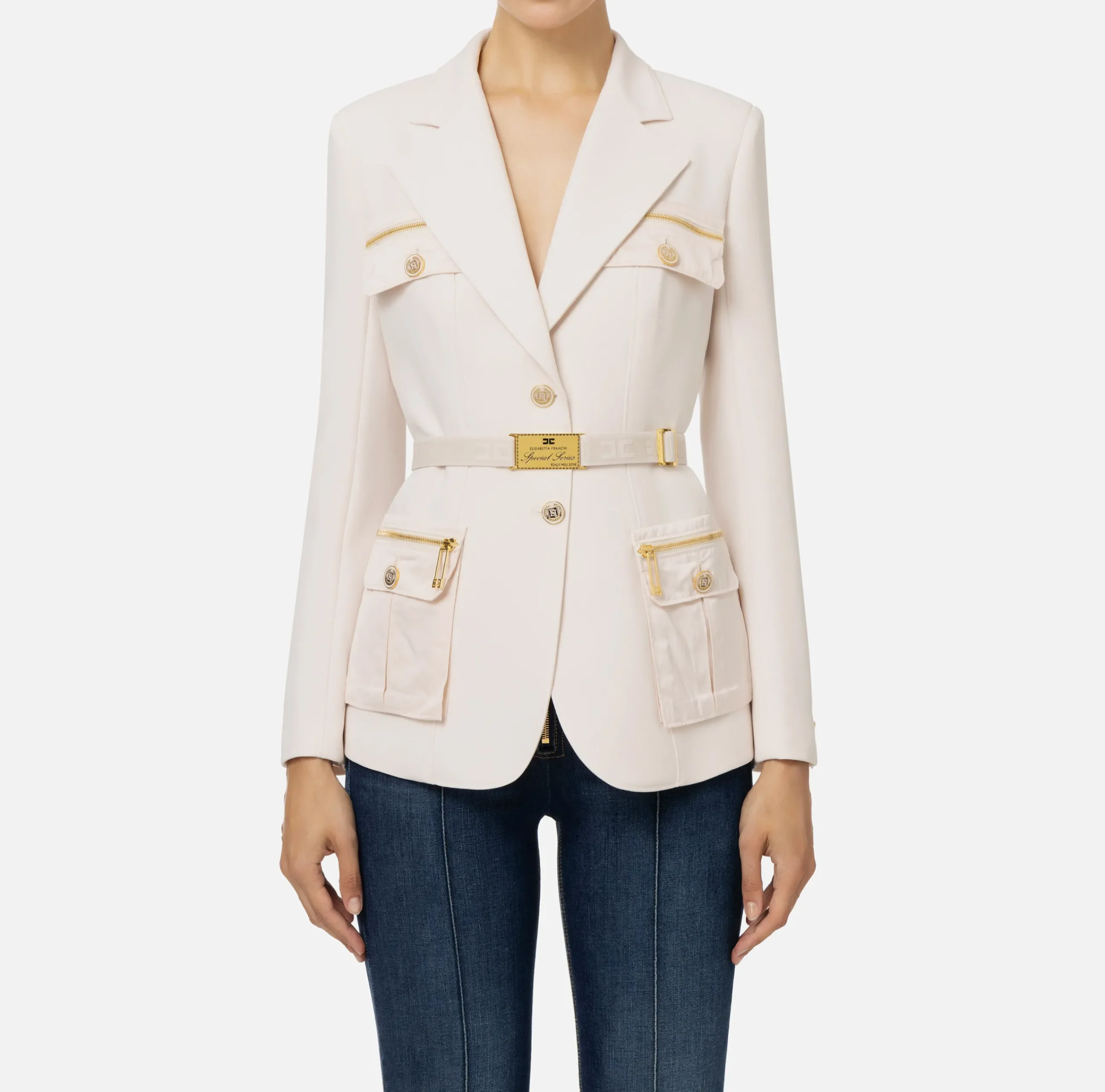 Giacca in crêpe stretch con chiusura monopetto e tasche a soffietto con zip in nylon tecnico. Il punto vita è enfatizzato da una cintura in elastico logato con fibbia in metallo dorato.