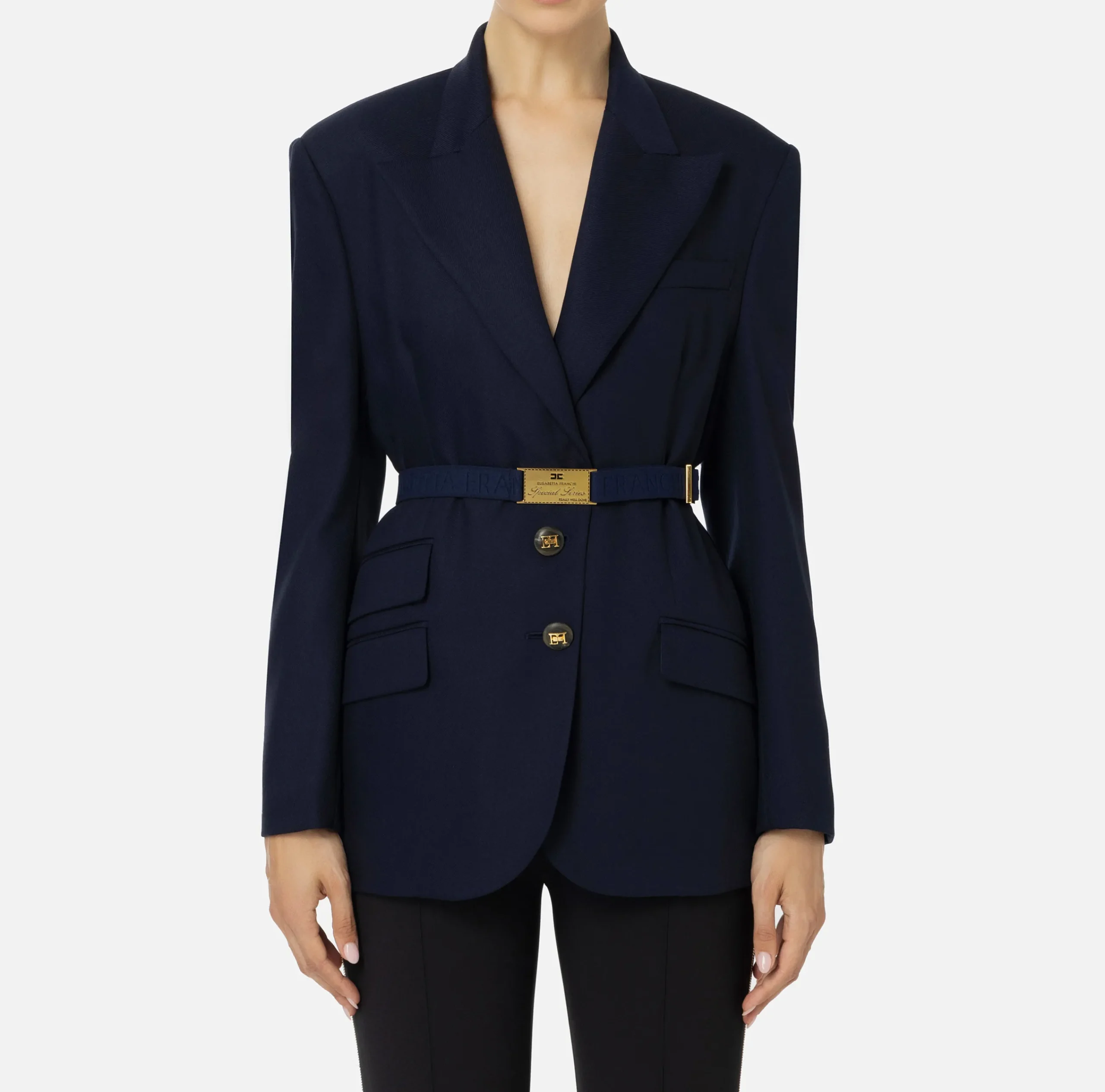 Giacca in fresco di lana stretch con spalle strutturate, chiusura monopetto e tasche frontali con pattina. Il punto vita è enfatizzato da una cintura in elastico logato con fibbia in metallo dorato.