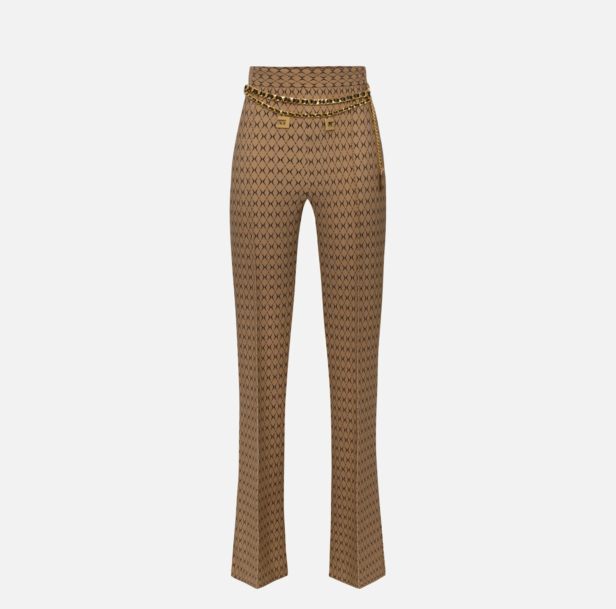 Pantalone a palazzo in doppio crêpe stretch stampa rombo. Il punto vita è enfatizzato da una cintura in catena infilata e charms logo in metallo dorato.
