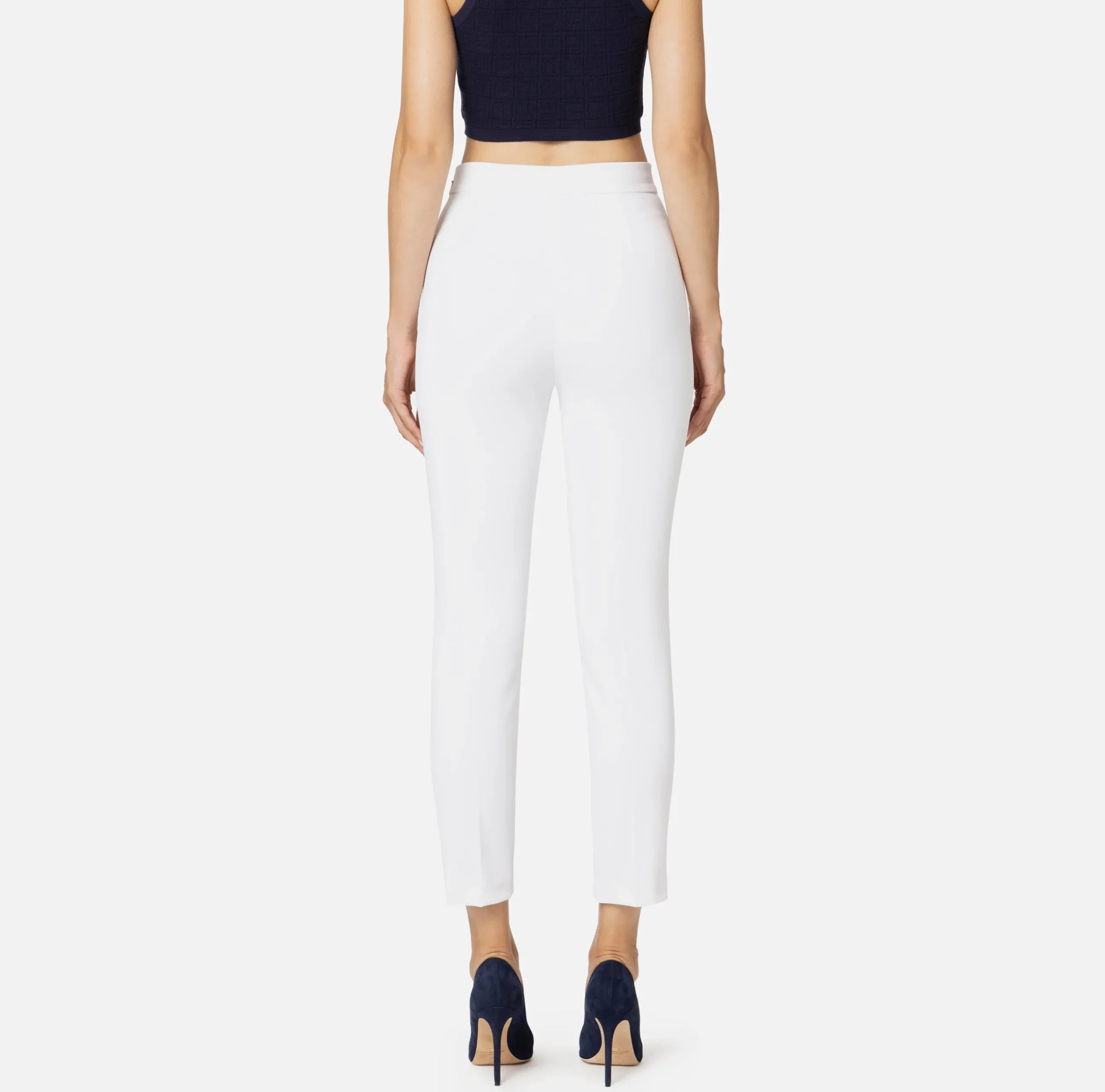 Pantalone dritto alla caviglia in doppio crêpe stretch. È caratterizzato da motivo di doppia zip con tiretto logato inserite sotto il fascione.