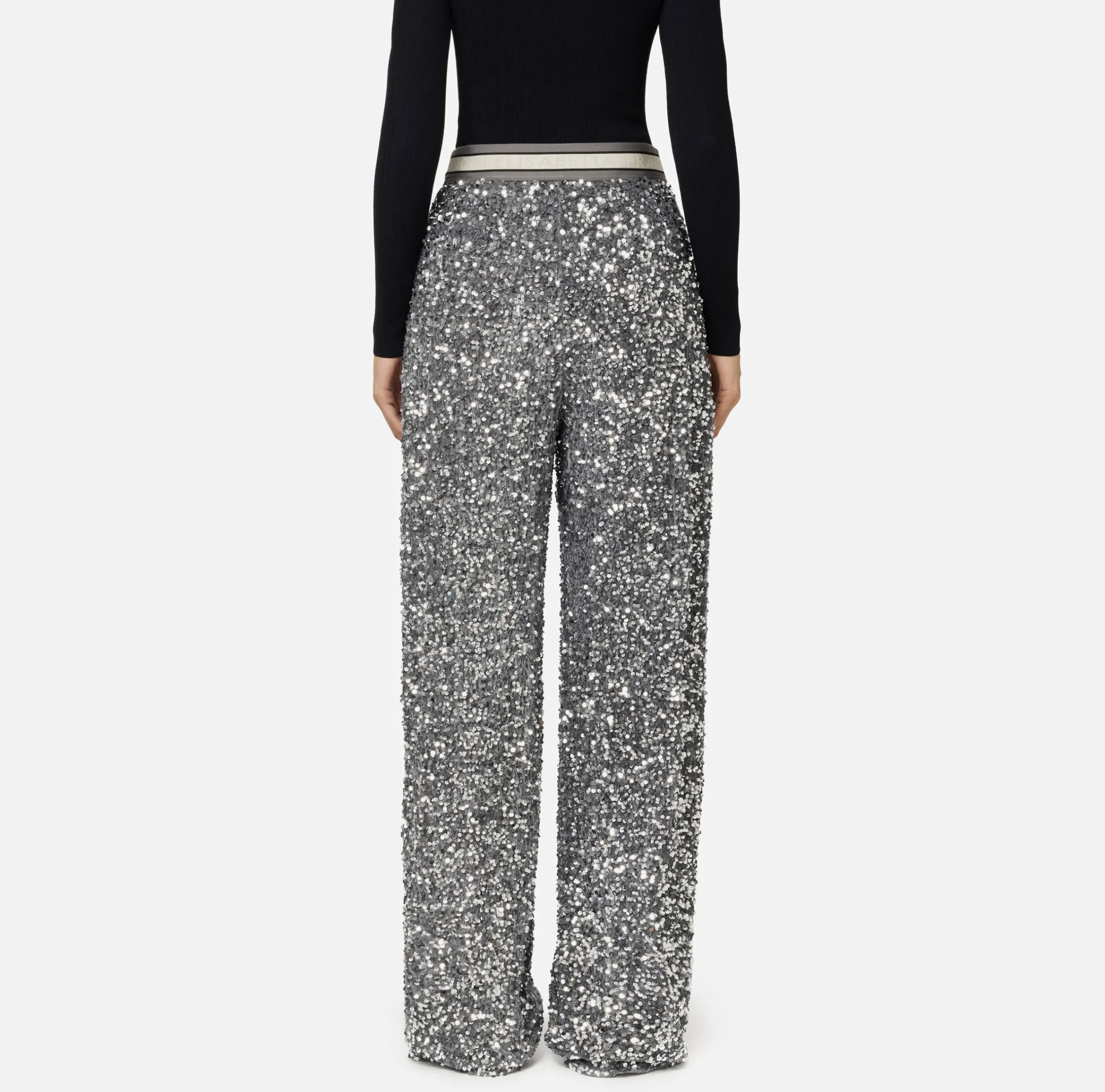Tailleur|Pantaloni E Shorts|Elisabetta Franchi Pantalone in ciniglia ricamata con paillettes Steel