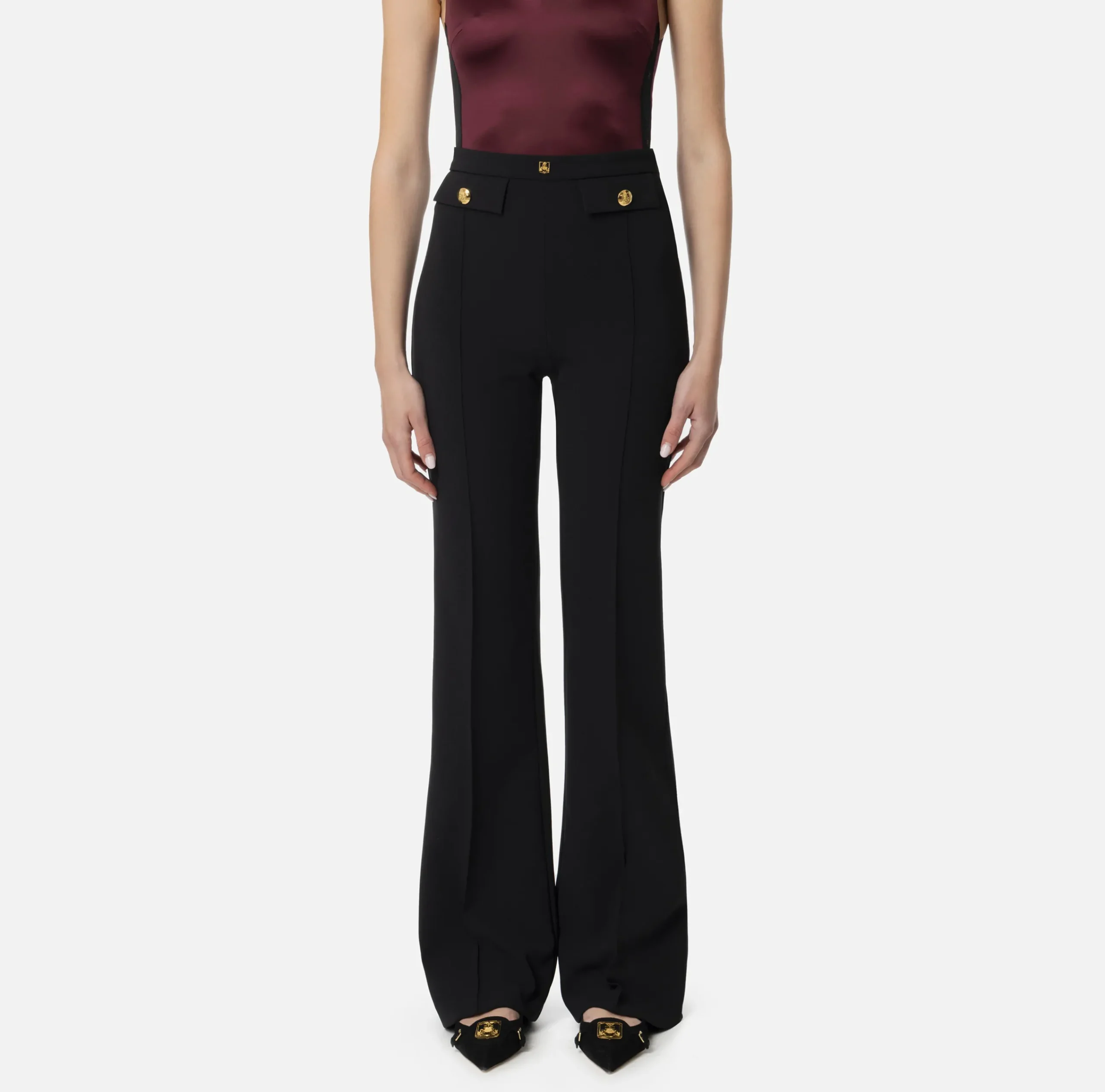 Pantalone palazzo in doppio crêpe stretch. È caratterizzato da fascione impreziosito da rivetto logo e tasche con patte rifinite da bottoni in metallo dorato.