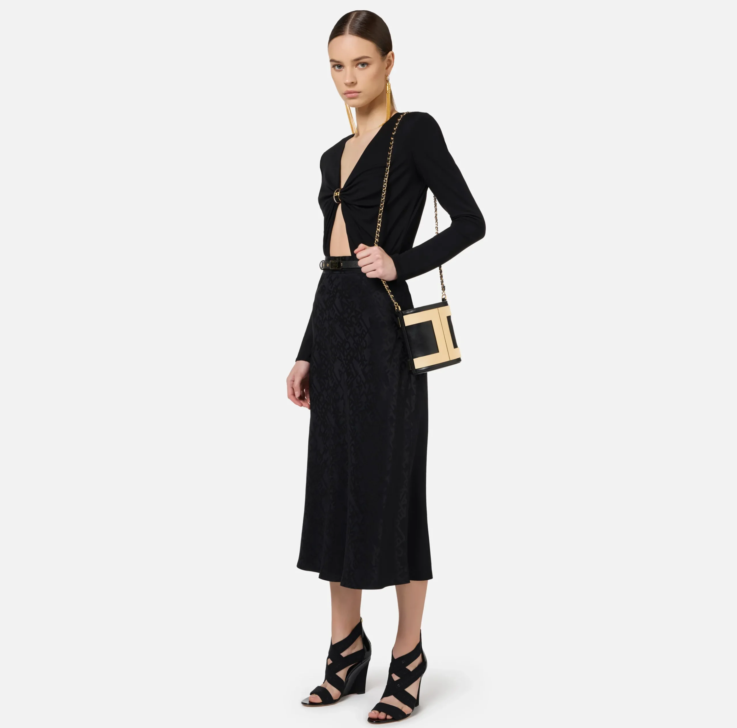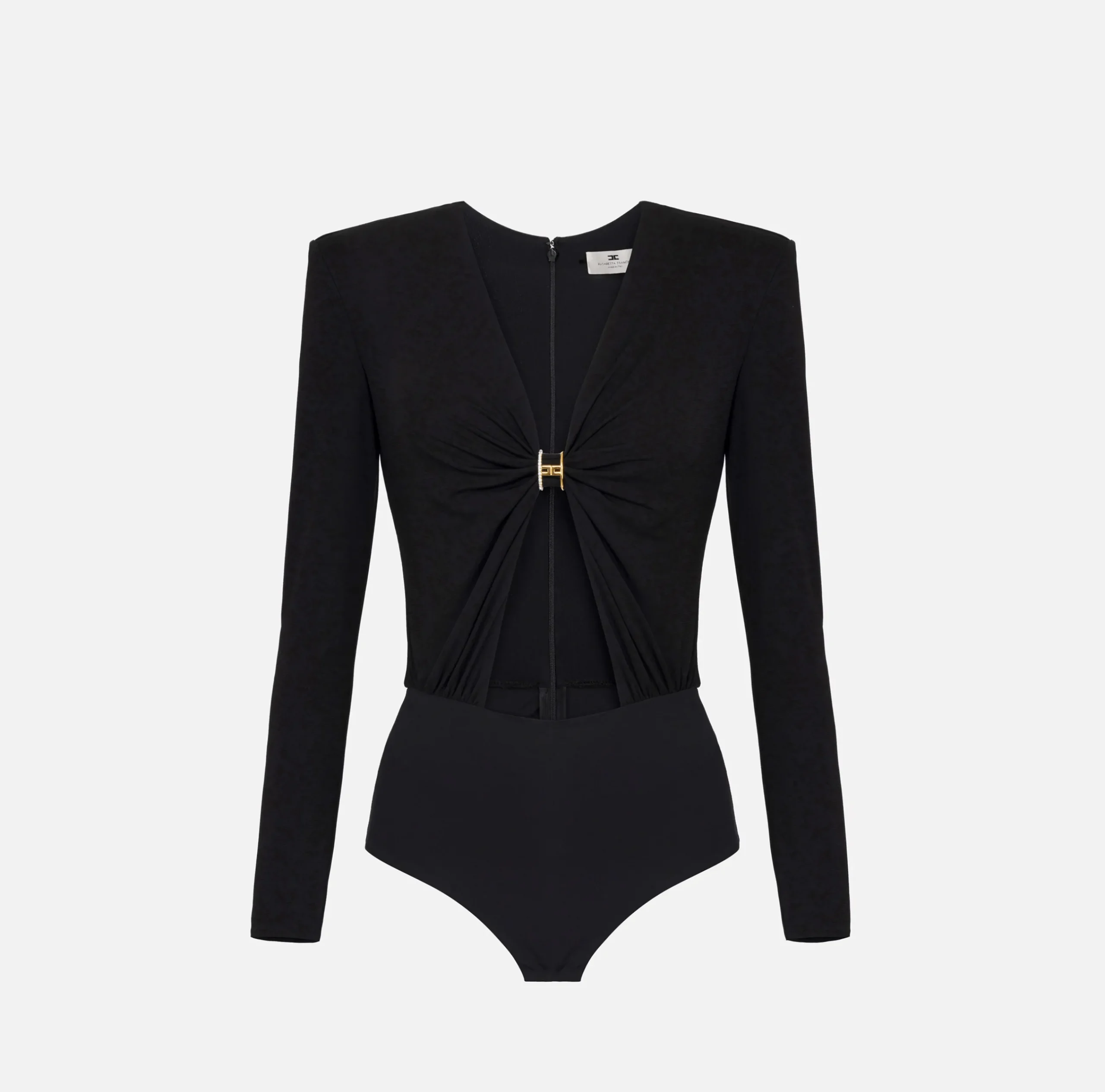 Body in jersey fluido a maniche lunghe con cut-out in vita. È caratterizzato da profondo scollo con nodo sul davanti trattenuto da accessorio logo ad anello in metallo dorato e strass.