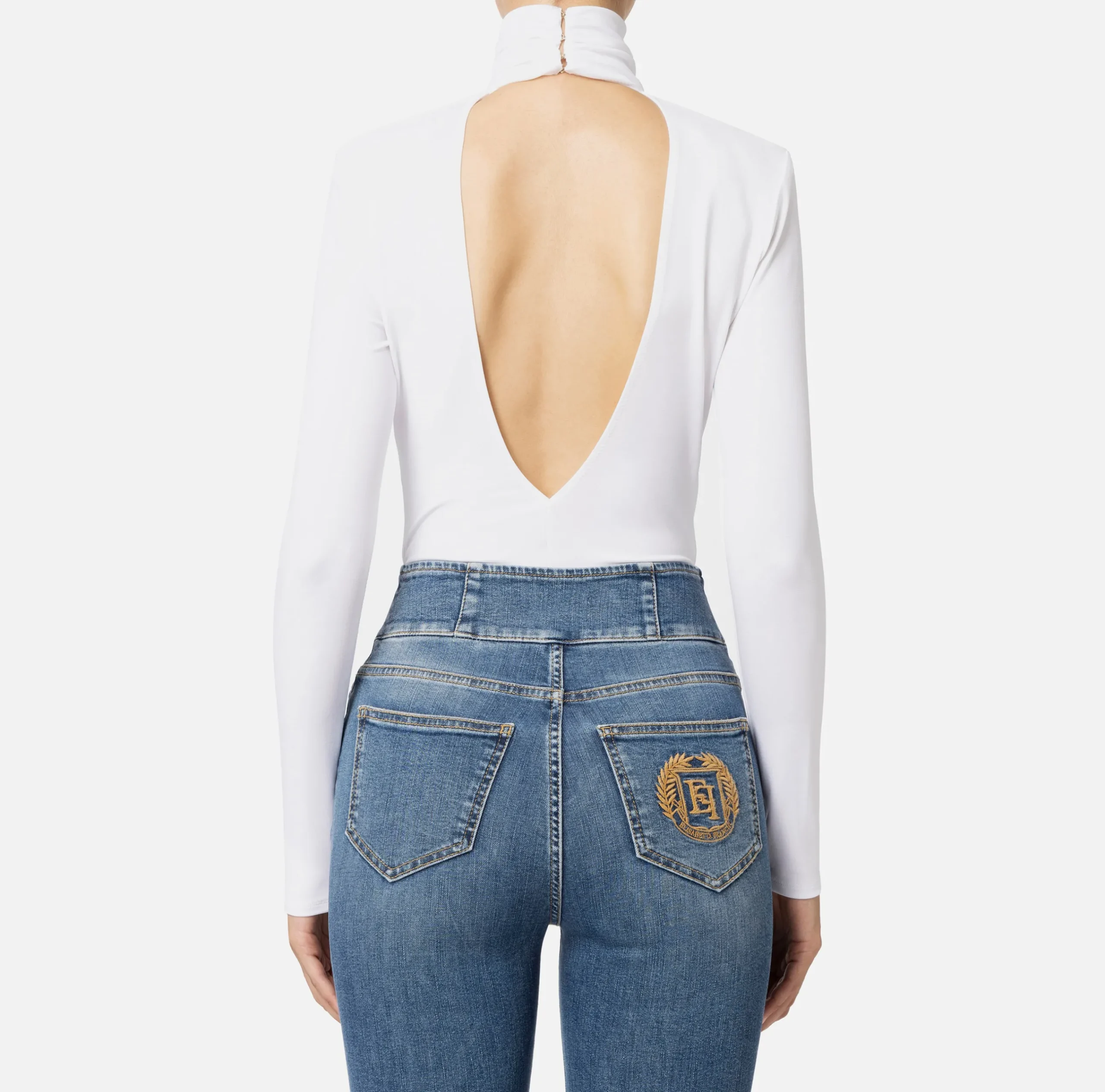 Body in jersey crêpe a maniche lunghe con profonda scollatura sulla schiena. È caratterizzato da collo alto da cui parte un drappeggio rifinito da una placca logo in metallo dorato e strass.