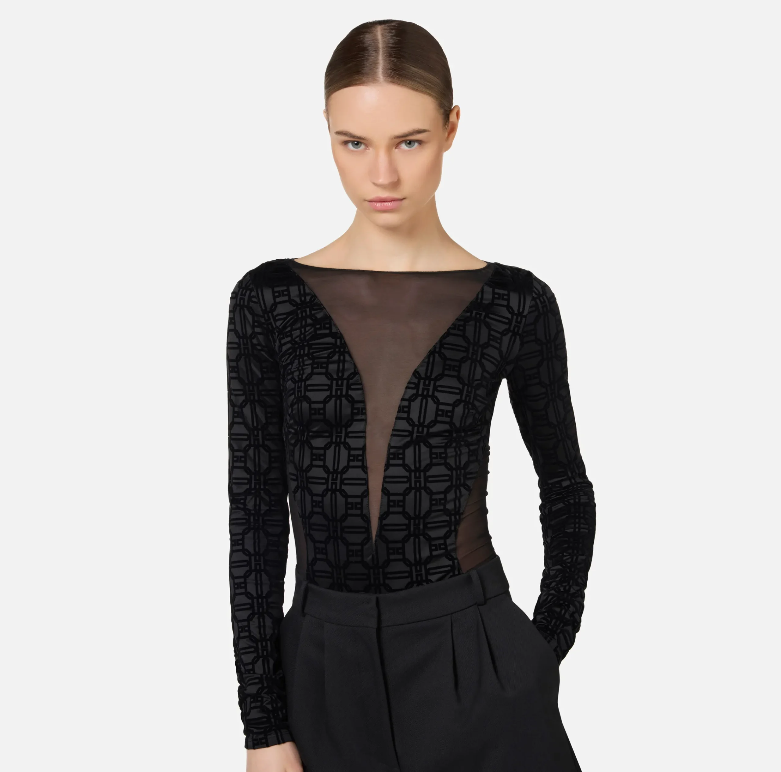 Body in lycra flock all-over con maniche lunghe a guanto e scollo a barca. È caratterizzato da inserti in tulle stretch che creano trasparenze sul décolleté dalla profonda scollatura e sui fianchi.