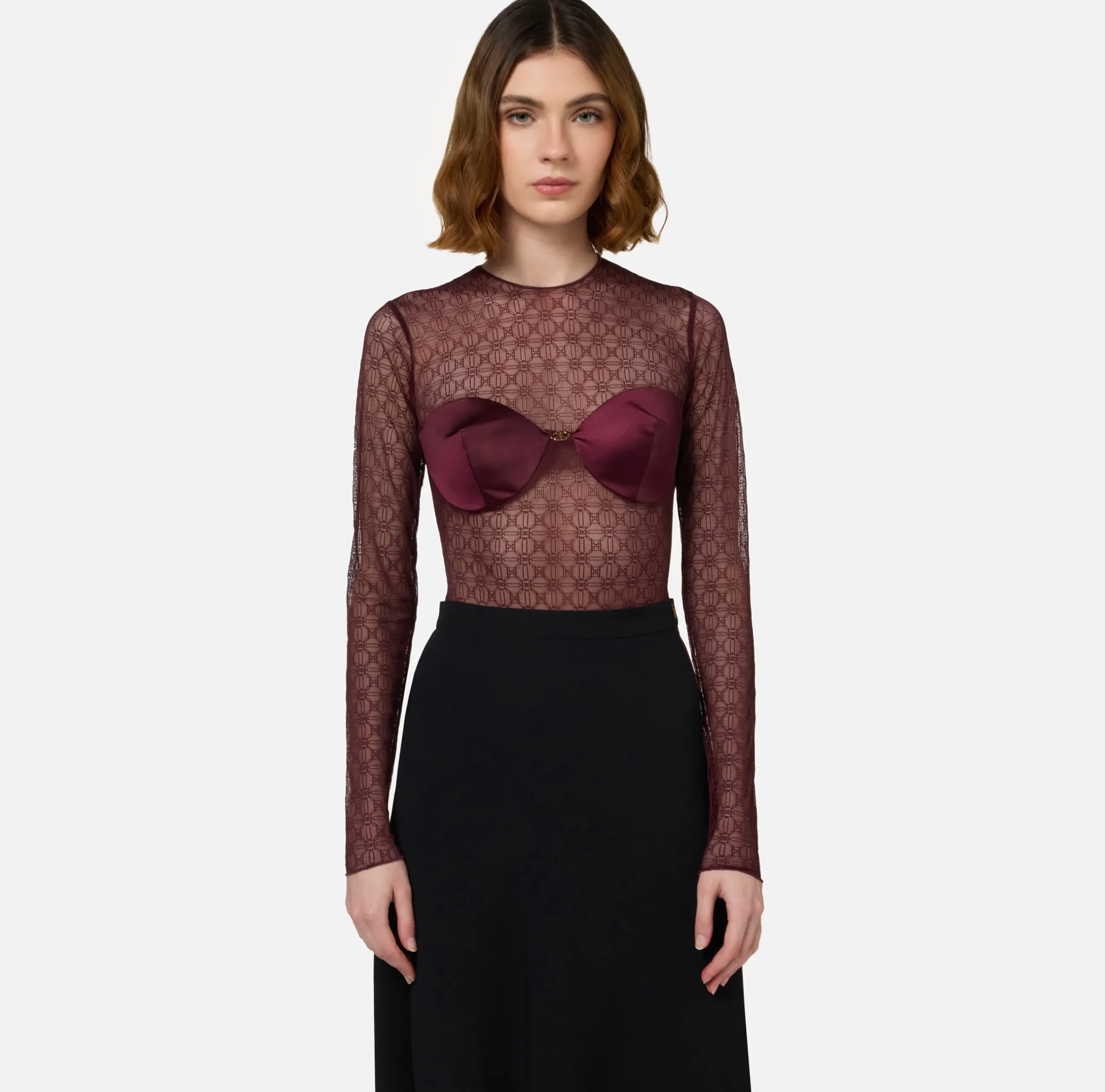 Body in tulle jacquard all-over a maniche lunghe con scollo a giro. È caratterizzato da coppe in lycra rifinite da una placca logo in metallo dorato.