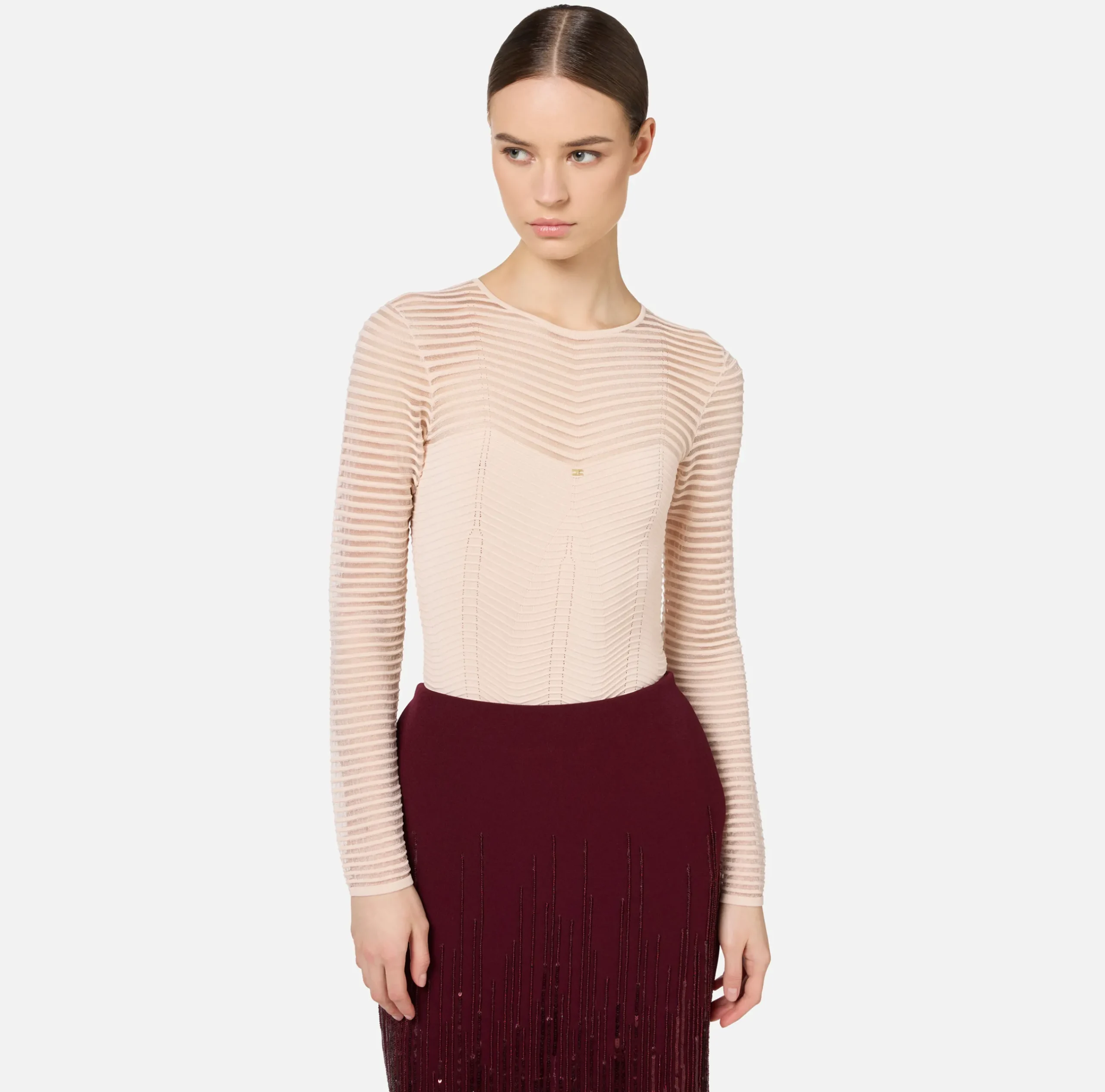 Body in viscosa motivo chevron tridimensionale alternato a un punto rete. È caratterizzato da maniche lunghe trasparenti e scollo a giro.
