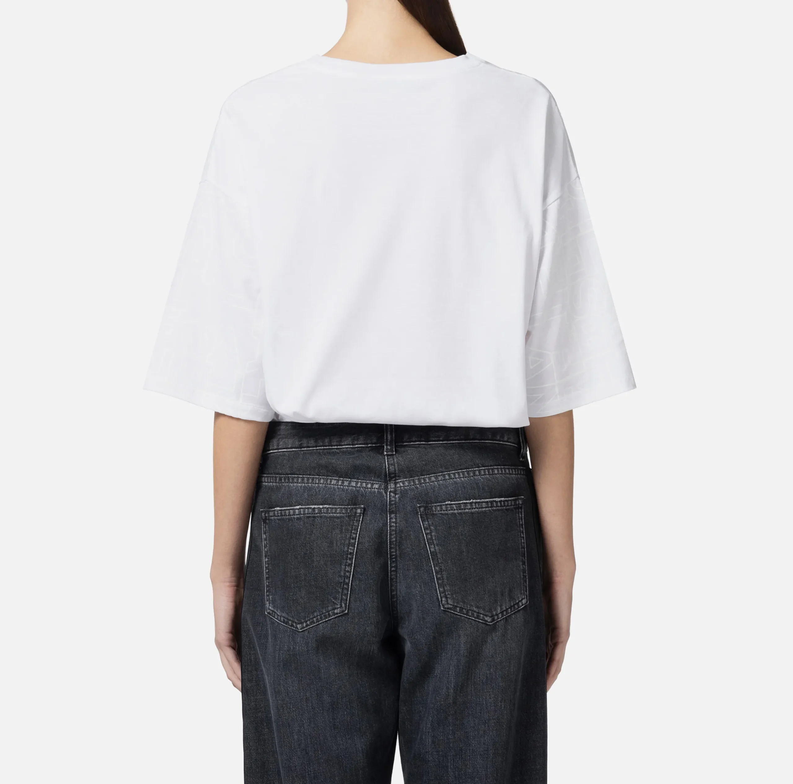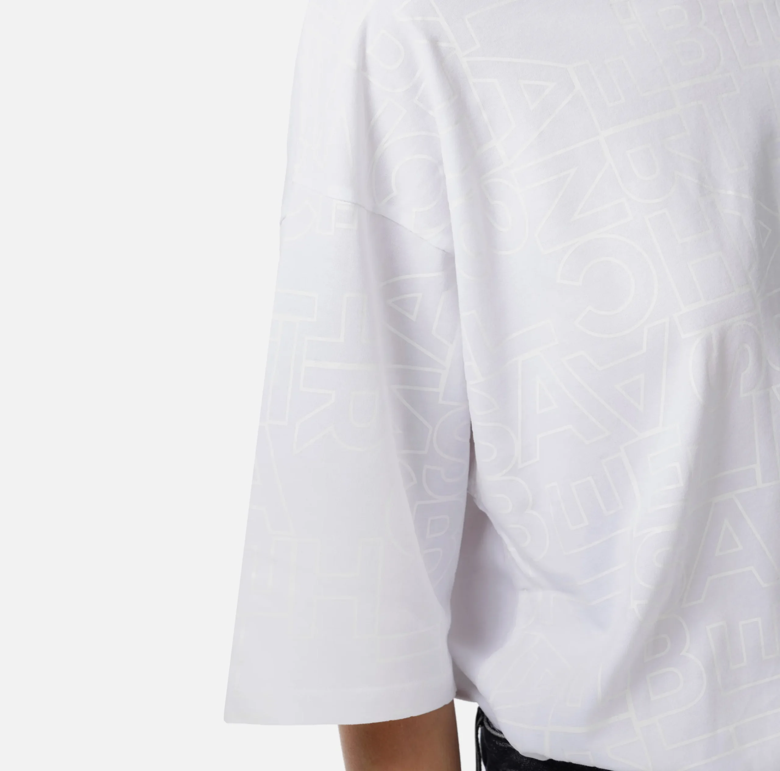 T-shirt in jersey di cotone con lettering lucido all-over in tono. È caratterizzata da maniche con spalle scese.