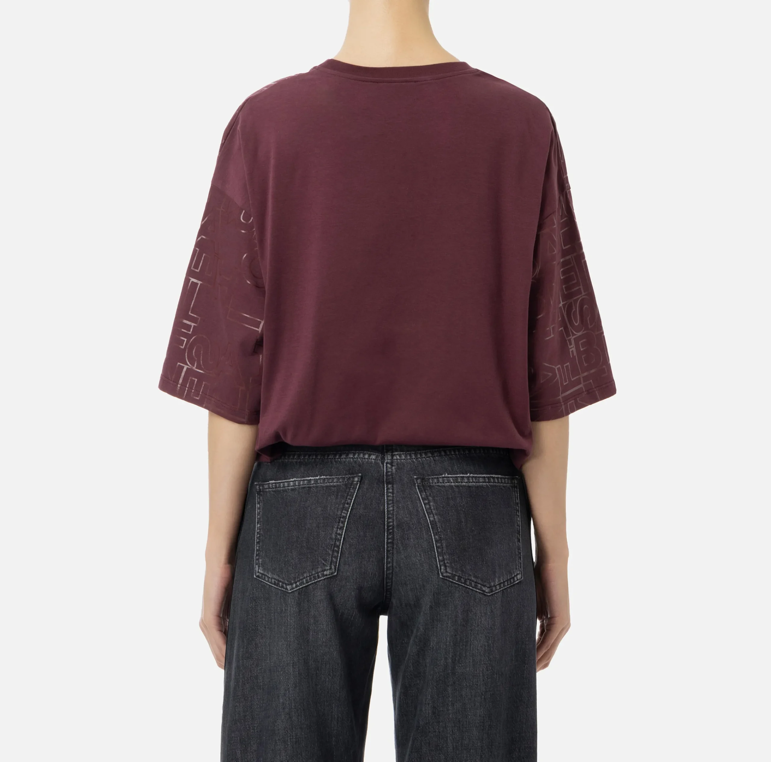 T-shirt in jersey di cotone con lettering lucido all-over in tono. È caratterizzata da maniche con spalle scese.
