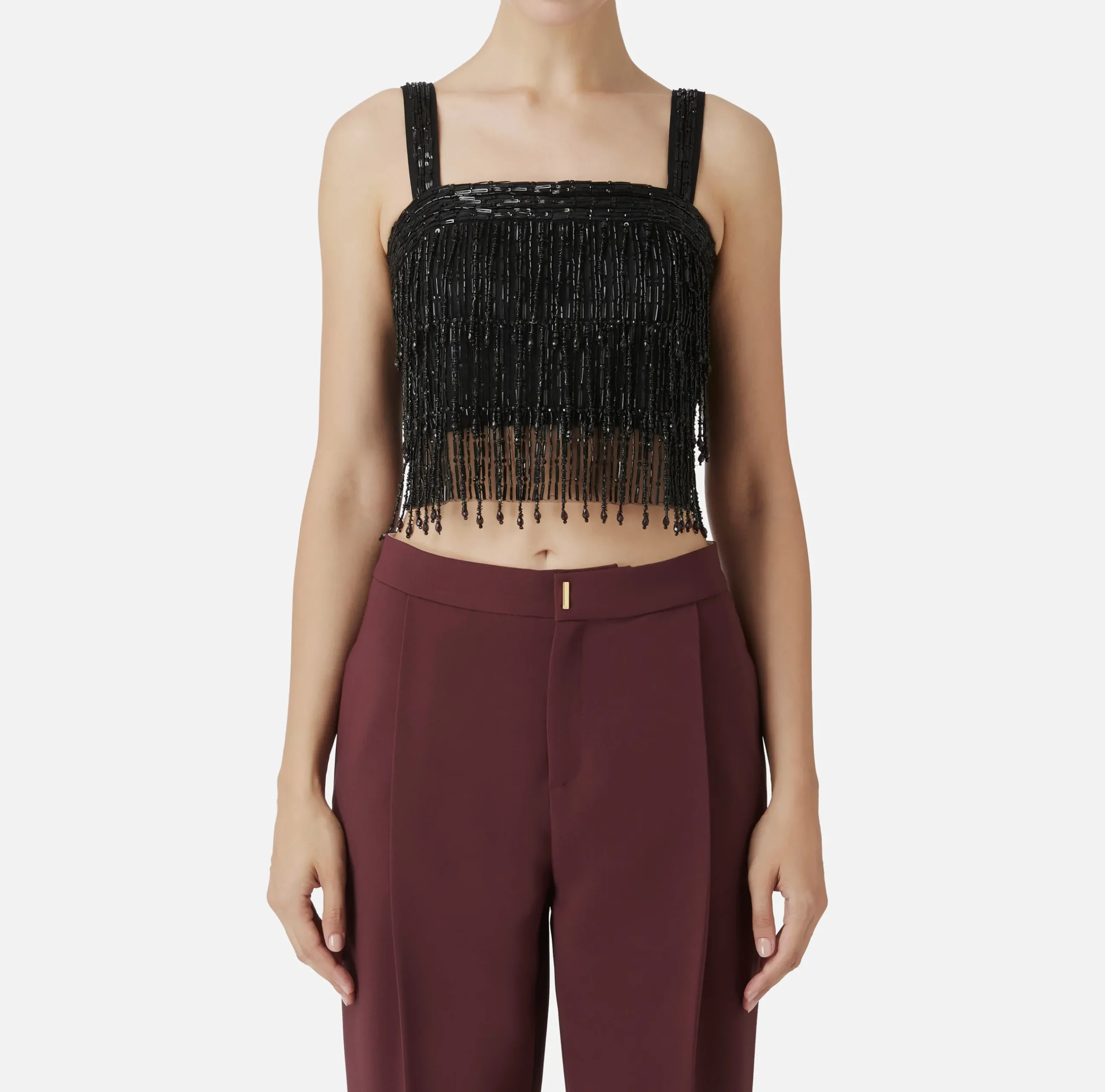 Top a fascia in crêpe leggero interamente ricamato a mano con frange di paillettes e canottiglie a goccia. È caratterizzato da spalline regolabili e zip posteriore.