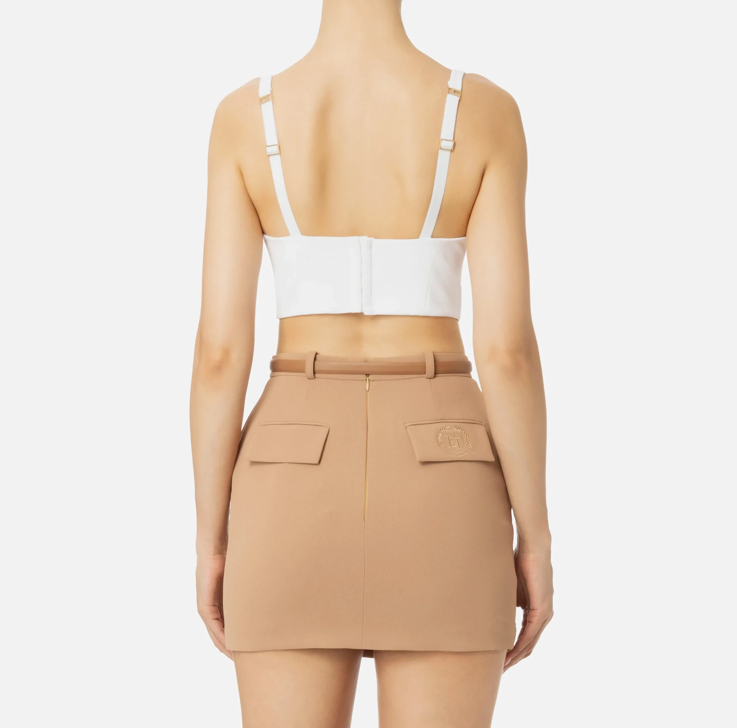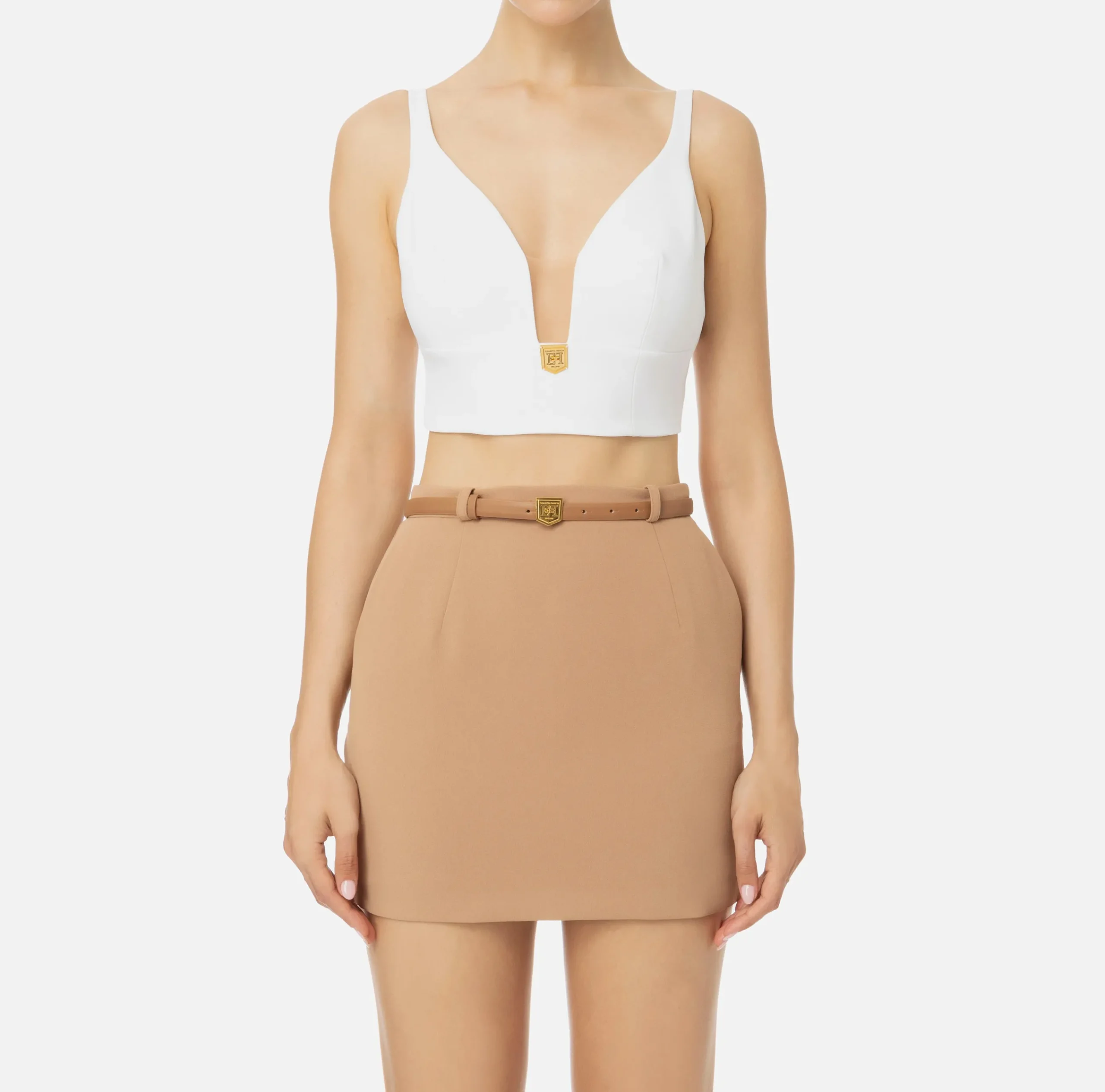Top in doppio crêpe stretch con spalline sottili. Applicazione di una placca logo in metallo dorato sul davanti.