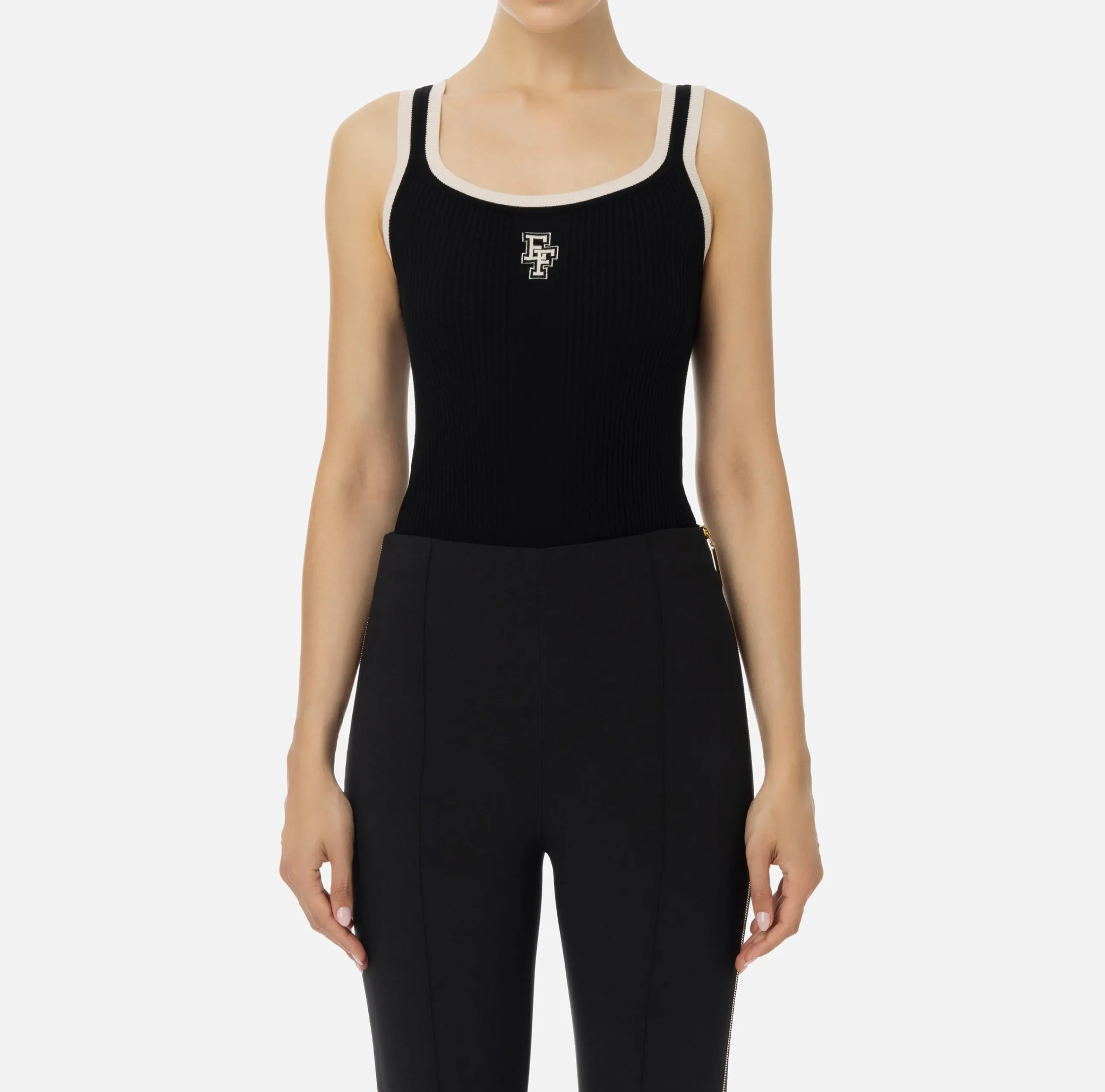 Top in misto viscosa a costine con profili e logo intarsiato in contrasto colore.