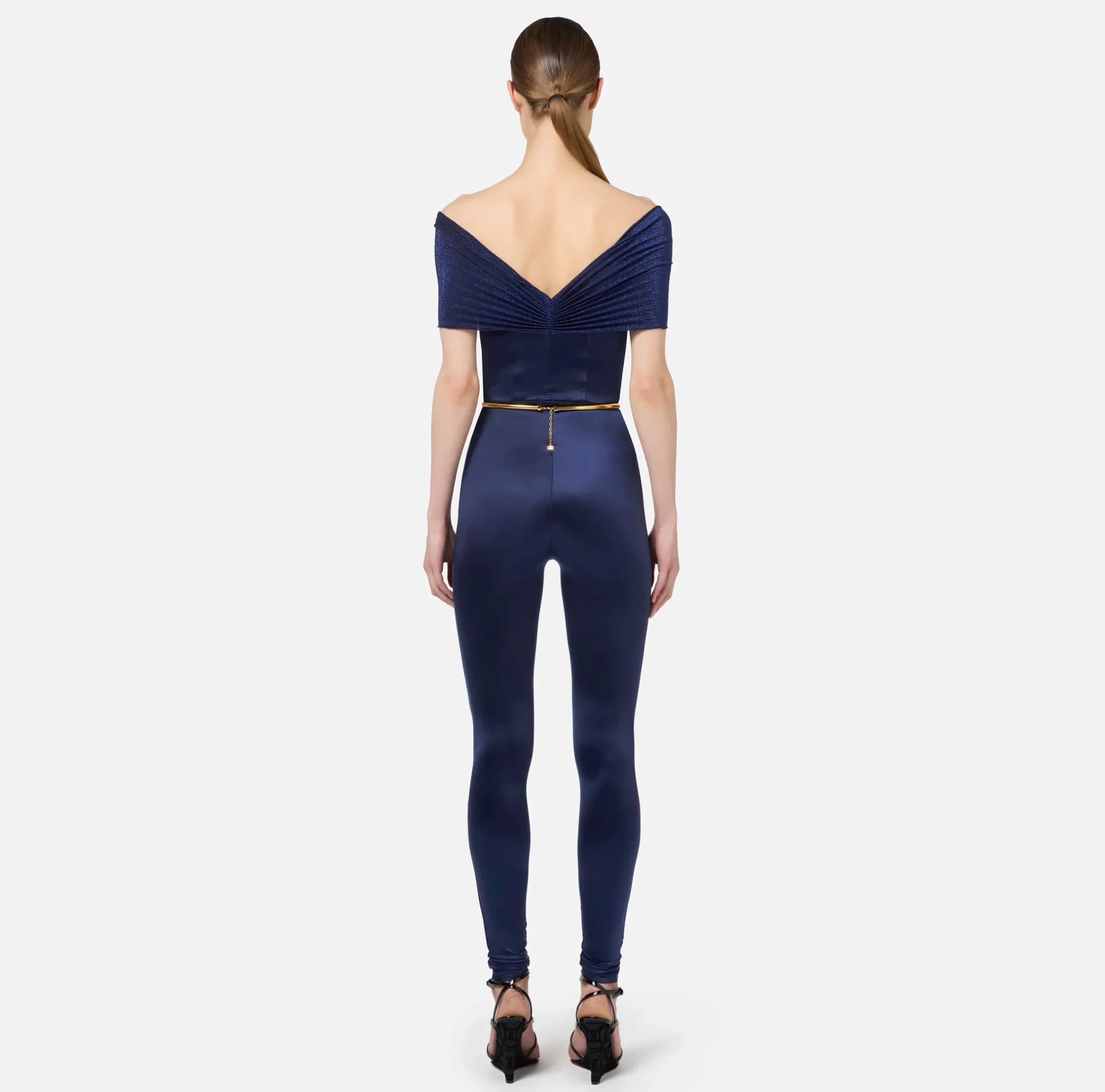 Tuta in lycra lucida composta da top bustier rifinito da fascia in jersey lurex plissettata che abbraccia le spalle e pantaloni skinny. Il punto vita è enfatizzato da una cintura in maglia metallica elastica con placca logo in metallo dorato.