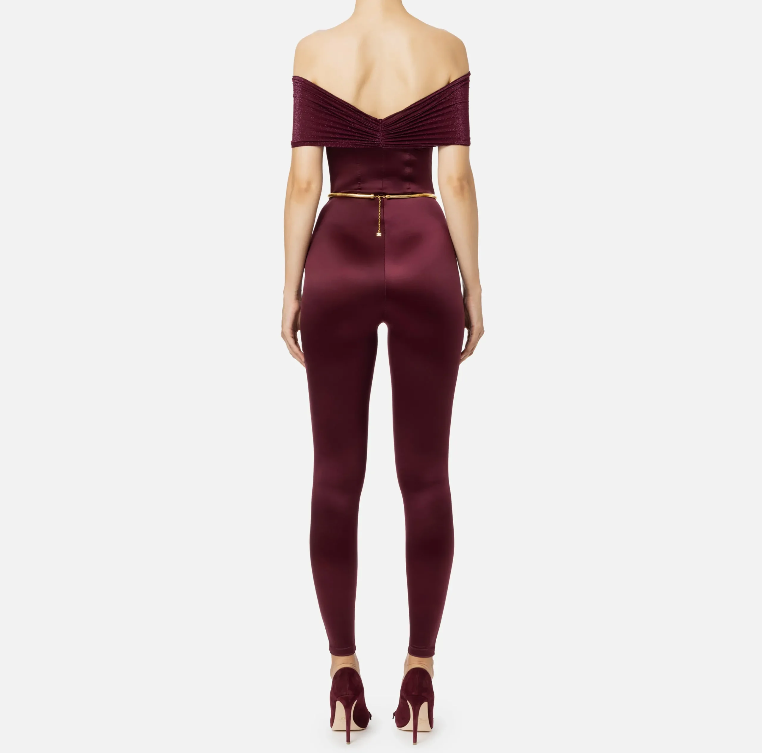 Tuta in lycra lucida composta da top bustier rifinito da fascia in jersey lurex plissettata che abbraccia le spalle e pantaloni skinny. Il punto vita è enfatizzato da una cintura in maglia metallica elastica con placca logo in metallo dorato.