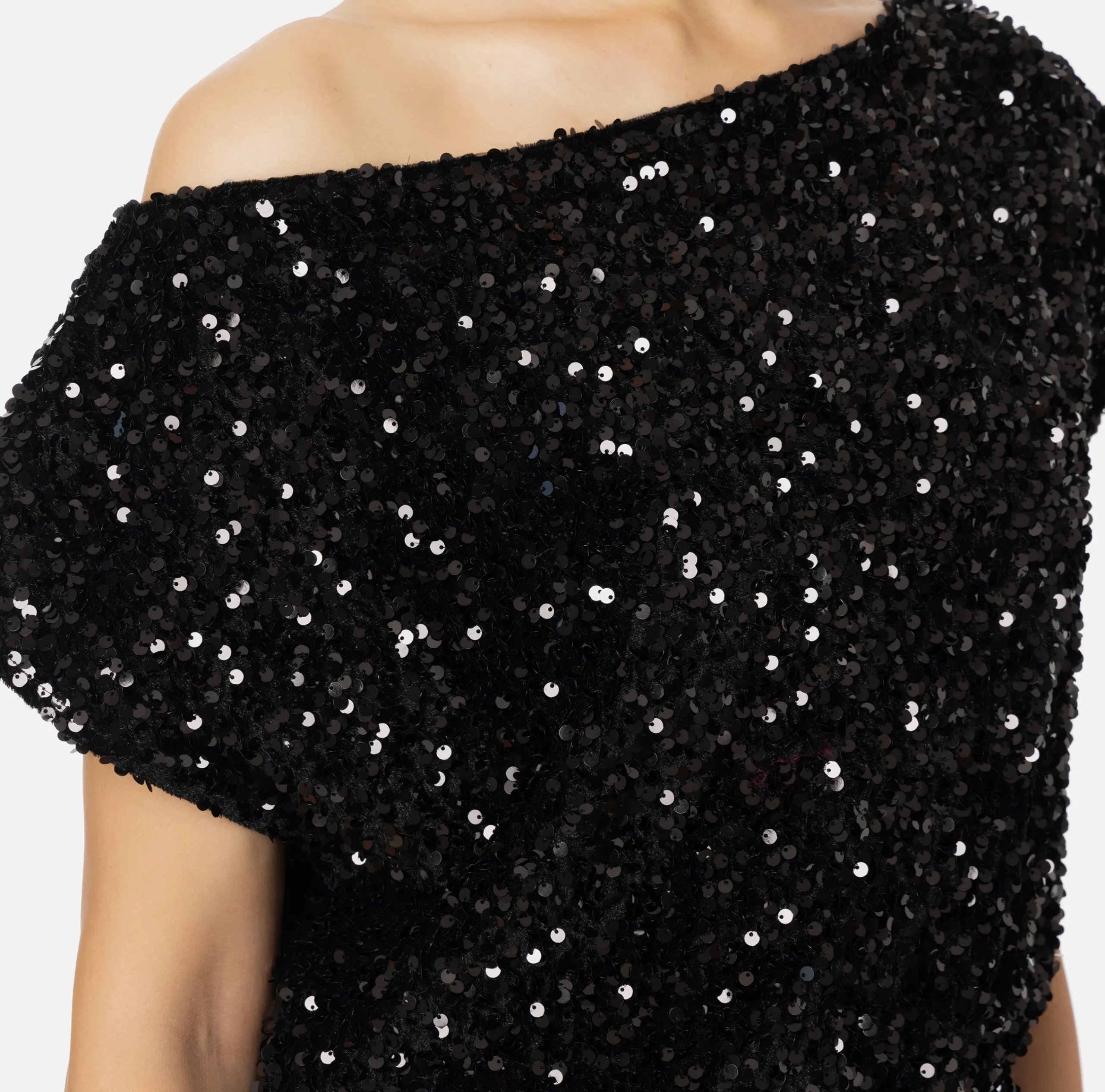 Tuta in ciniglia ricamata con pailettes composta da top smanicato con ampio scollo a barca e pantalone lungo con pinces.