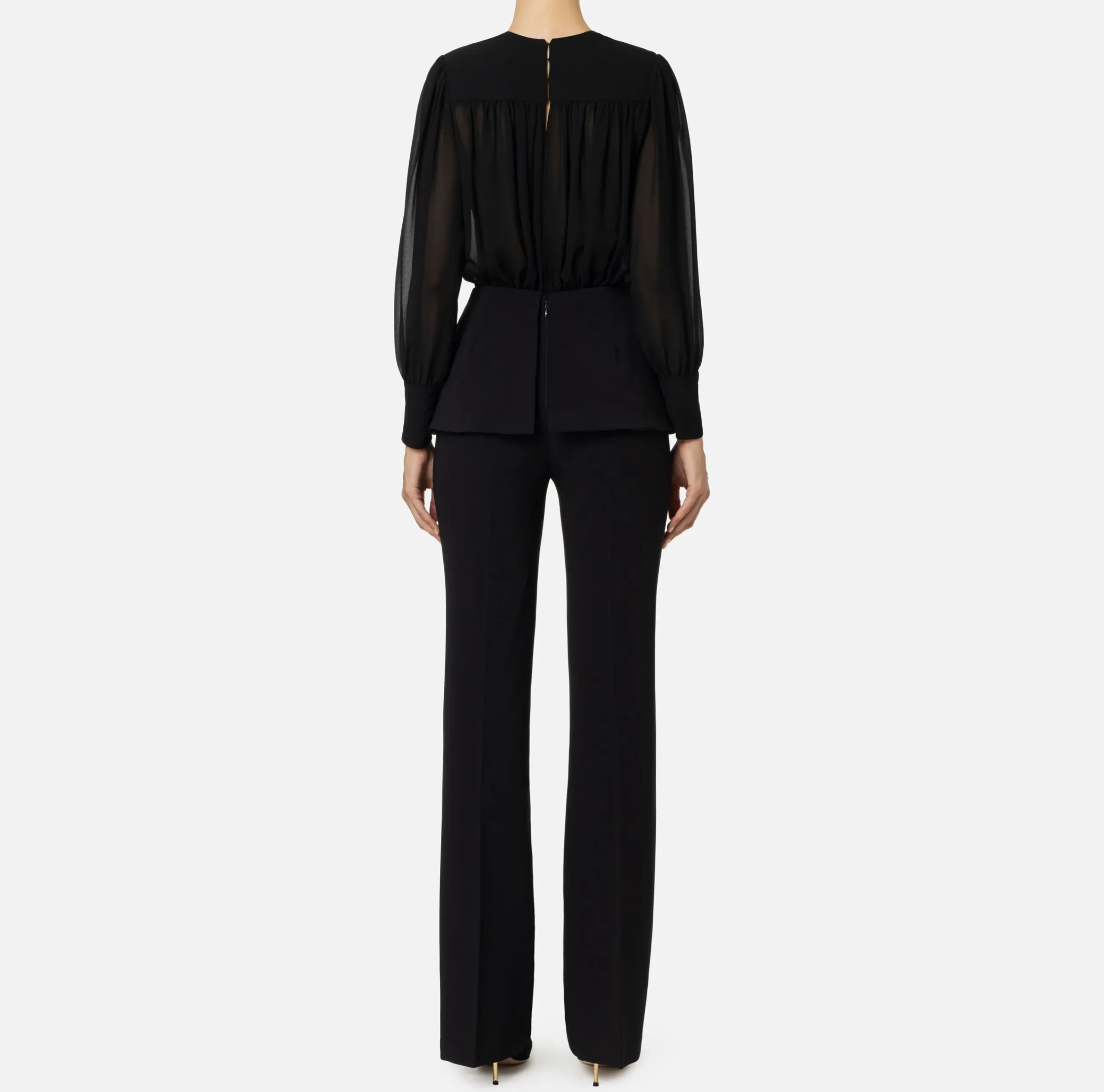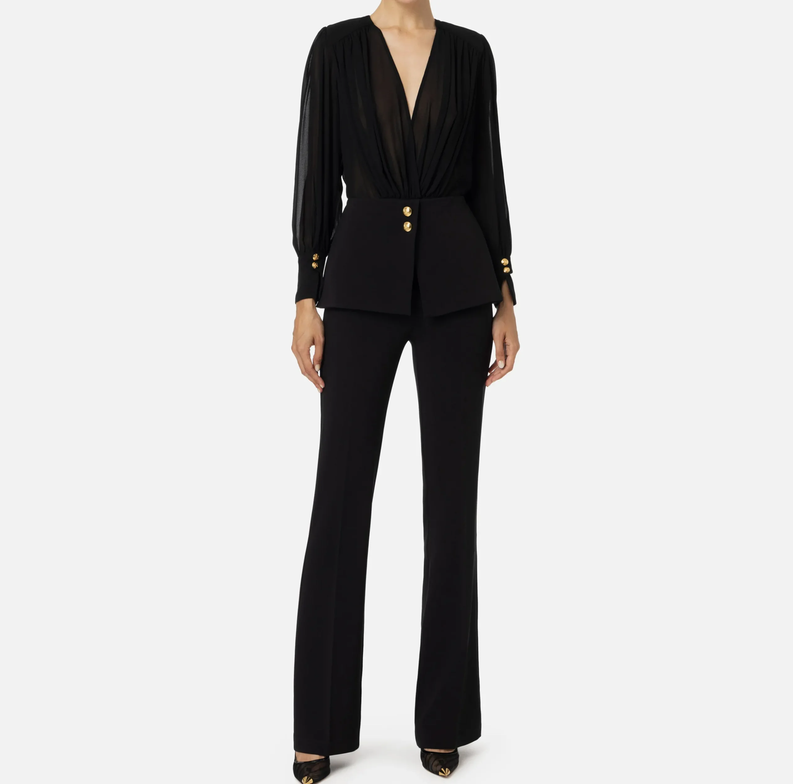 Tuta in crêpe composta da blusa staccabile in georgette a maniche lunghe con alti polsi e pantalone dritto svasato al fondo. Il punto vita è enfatizzato da una baschina chiusa da bottoni in metallo dorato che trattiene il profondo scollo incrociato.