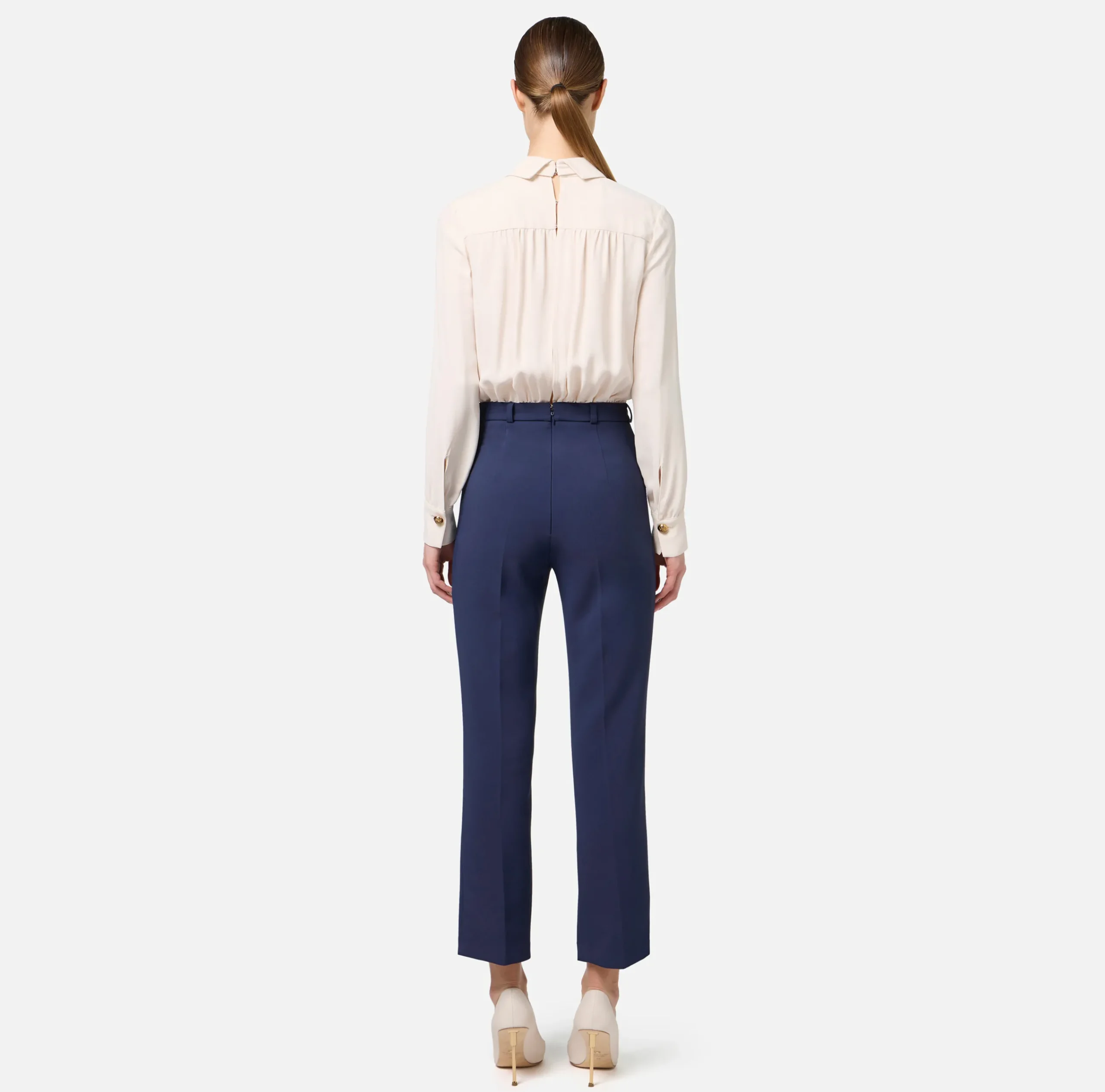 Tuta composta da camicia staccabile in doppia georgette di viscosa a maniche lunghe e pantalone a zampetta in doppio crêpe stretch alla caviglia. È caratterizzata da fiocco logato al collo.
