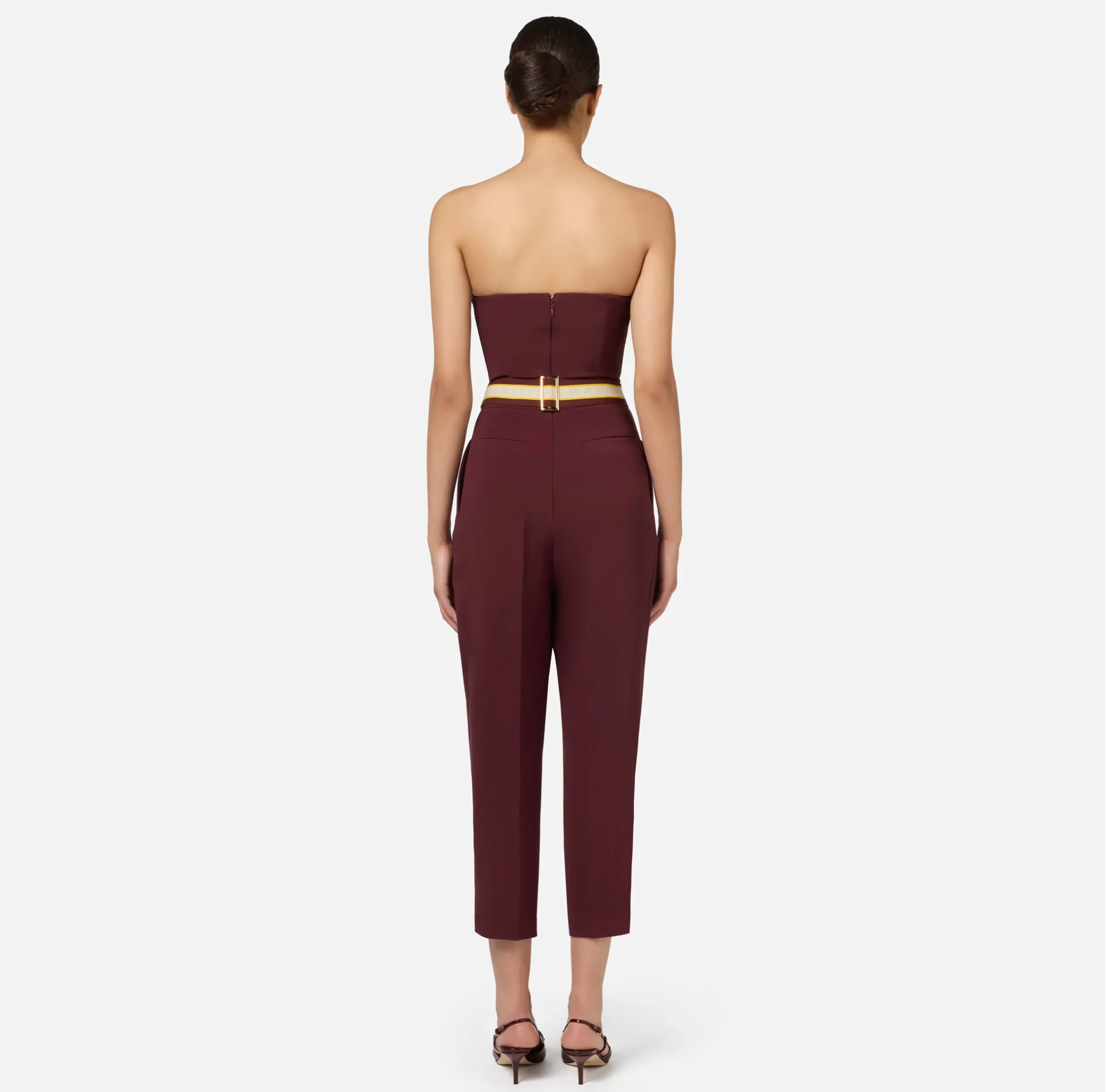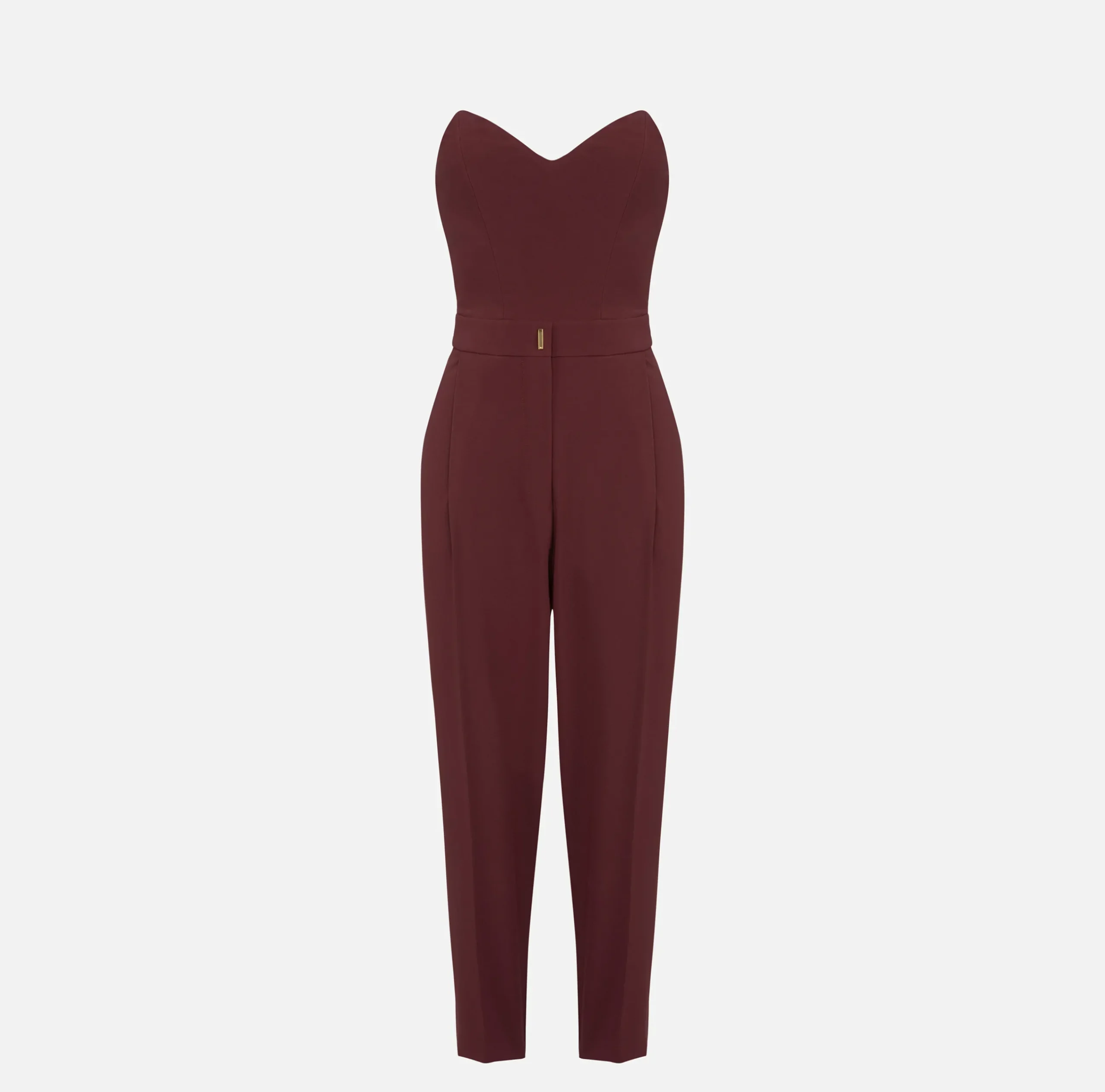 Tuta in crêpe stretch con top bustier a punta e pantalone cropped con ampie pinces. Il punto vita è enfatizzato da un fascione con placca verticale in metallo dorato.