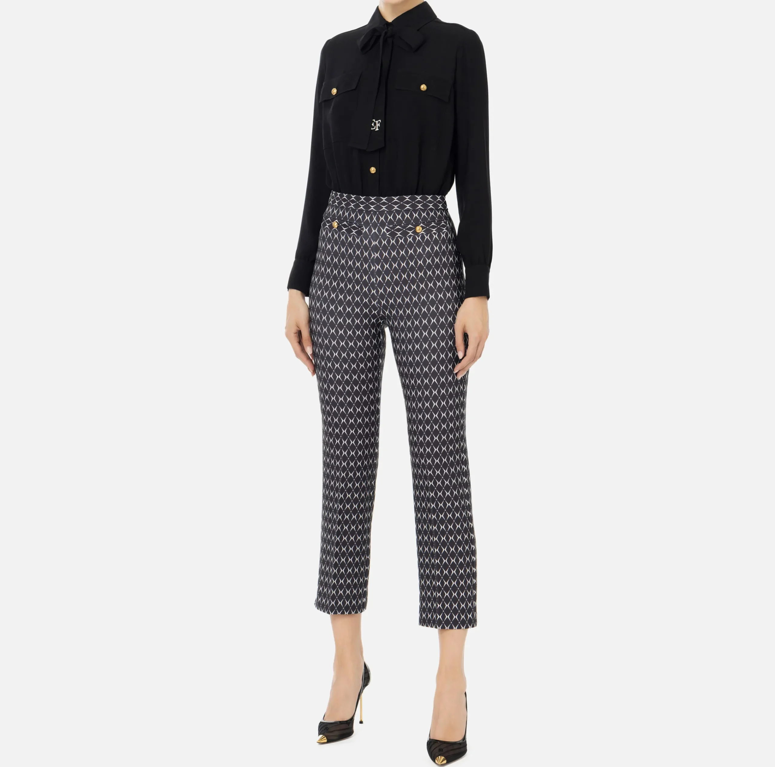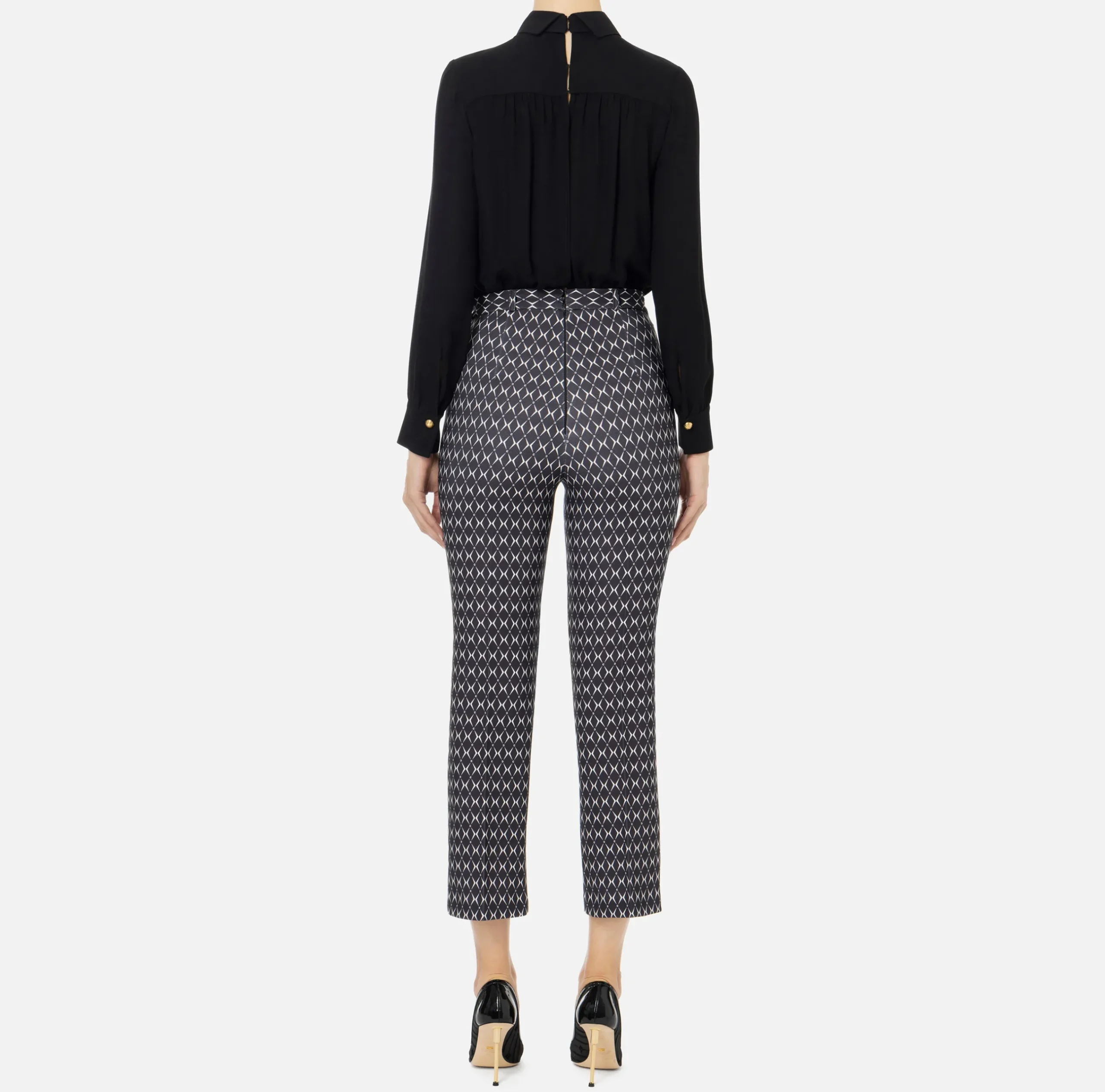Tuta composta da camicia staccabile in doppia georgette di viscosa a maniche lunghe e pantalone a zampetta in doppio crêpe stretch stampa rombo. È caratterizzata da fiocco logato al collo.